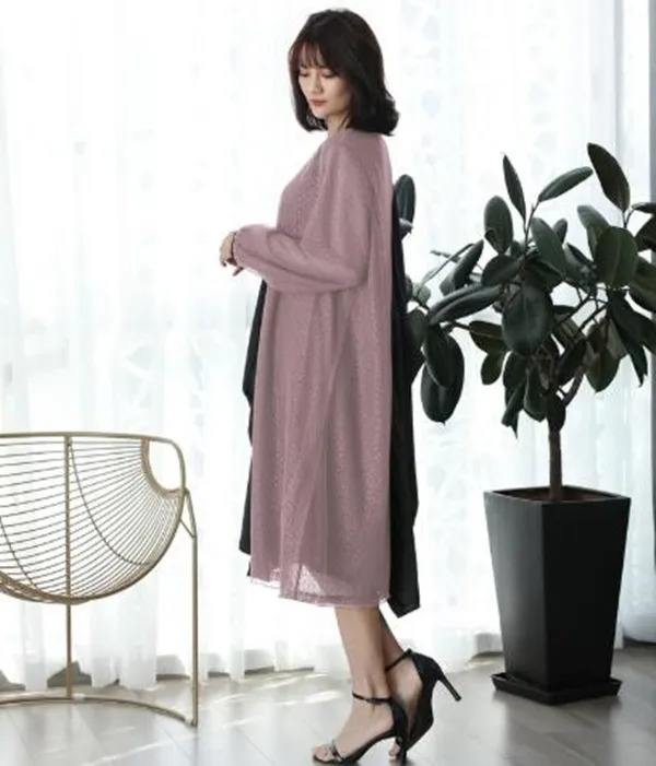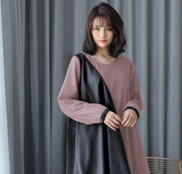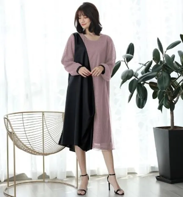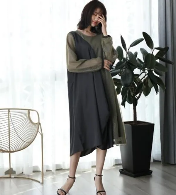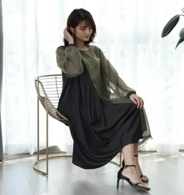衣都精品-圓領撞色拼接蕾絲立體剪裁氣質寬鬆連衣裙