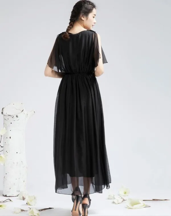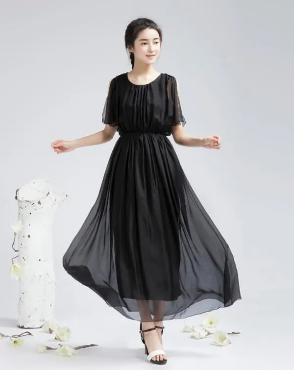 衣都-女春桑蠶絲短袖純色連衣裙文藝連衣裙