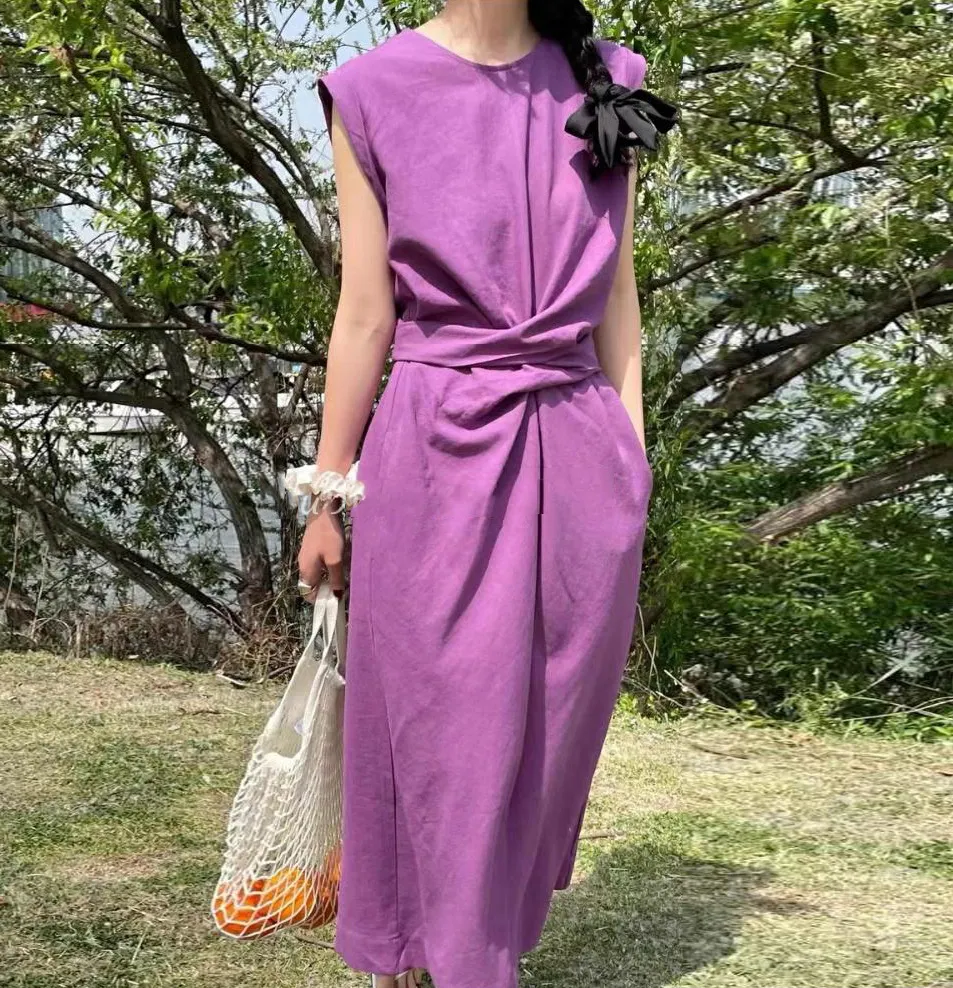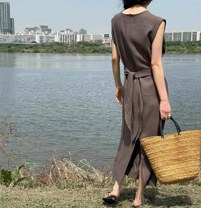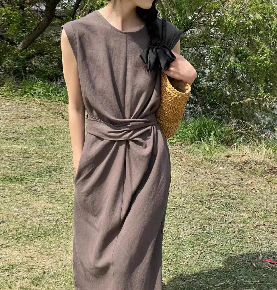 衣都精品- 2023新款韓版繫帶褶皺無袖長款連衣裙