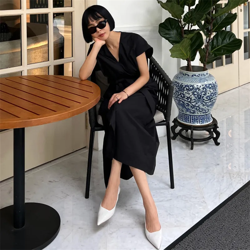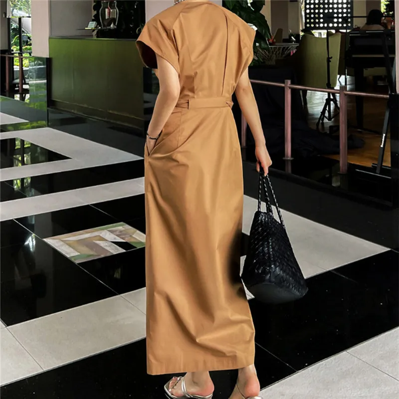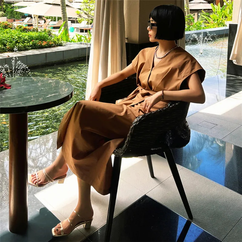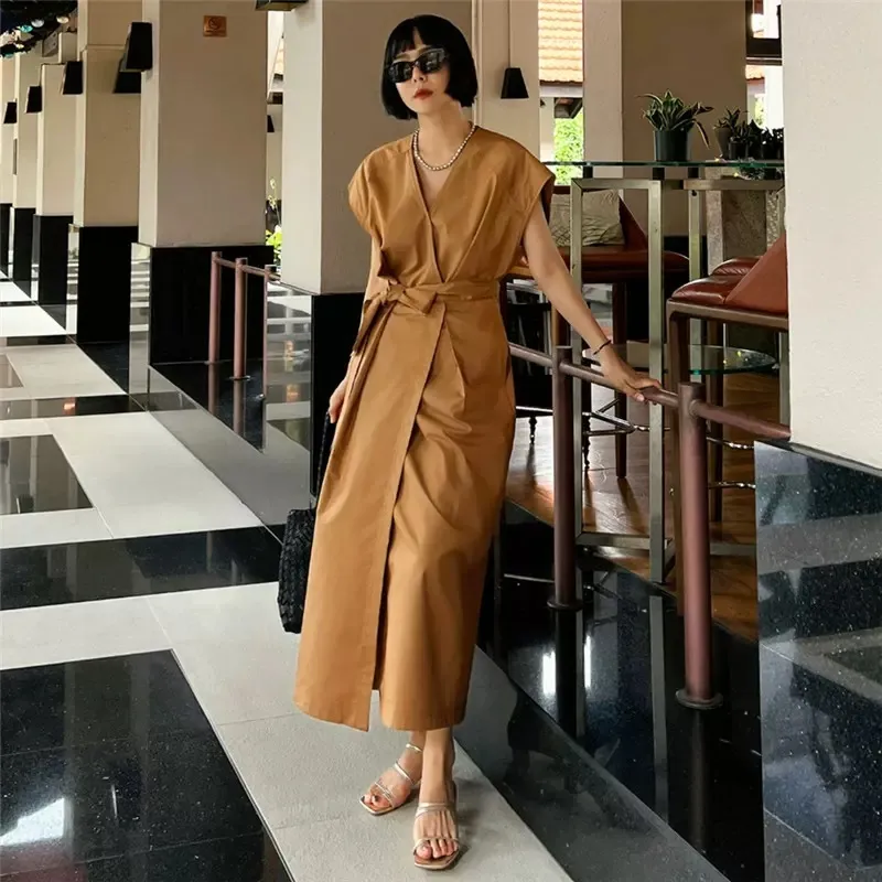 衣都精品- 2023新款韓版繫帶褶皺無袖長款連衣裙