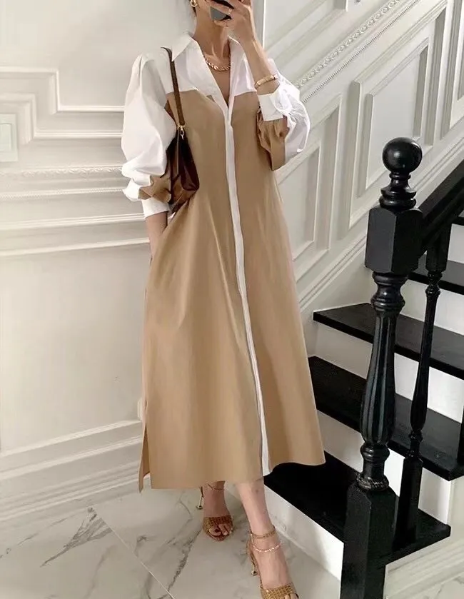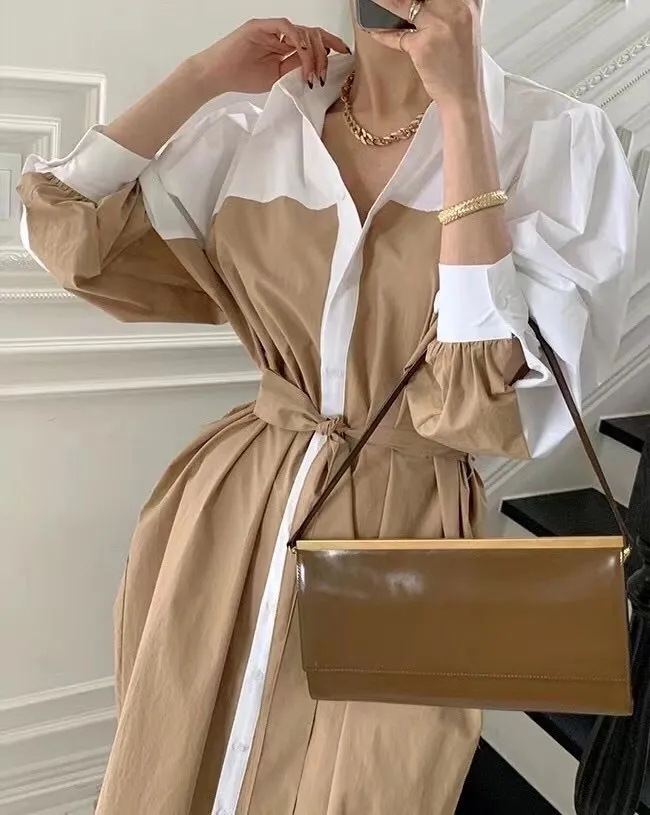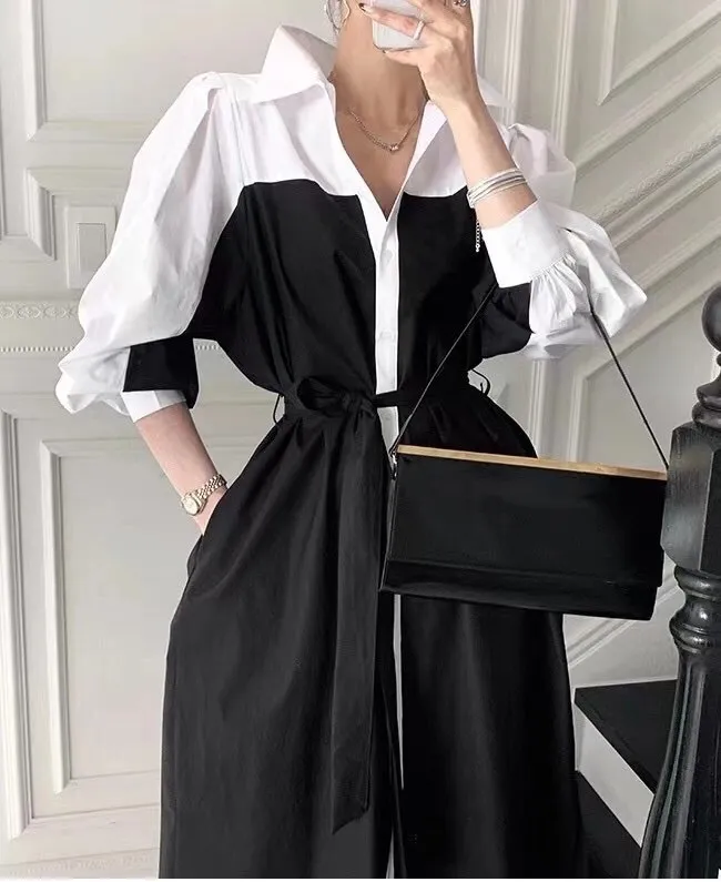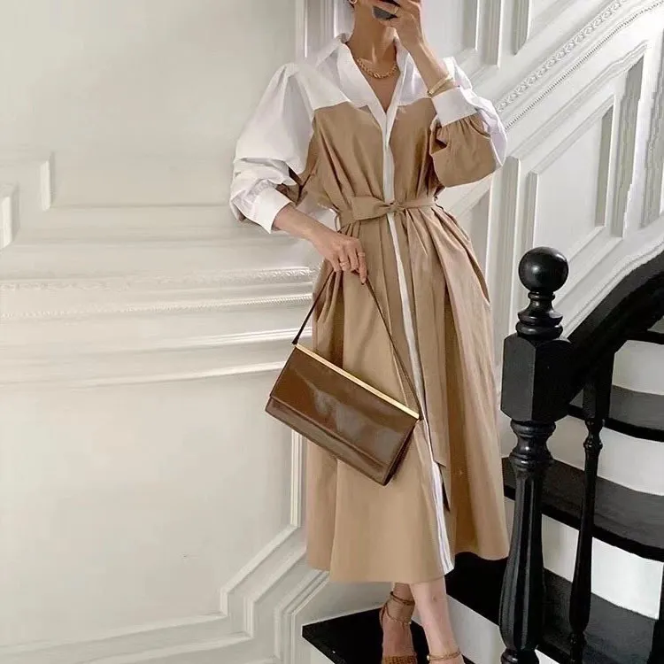 衣都精品- 2023新款韓版時髦拼色繫腰連衣裙