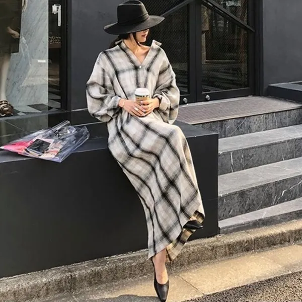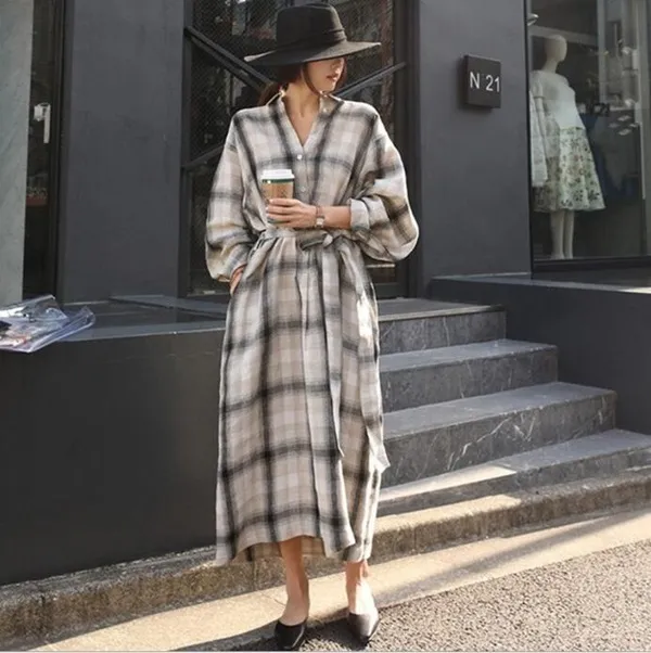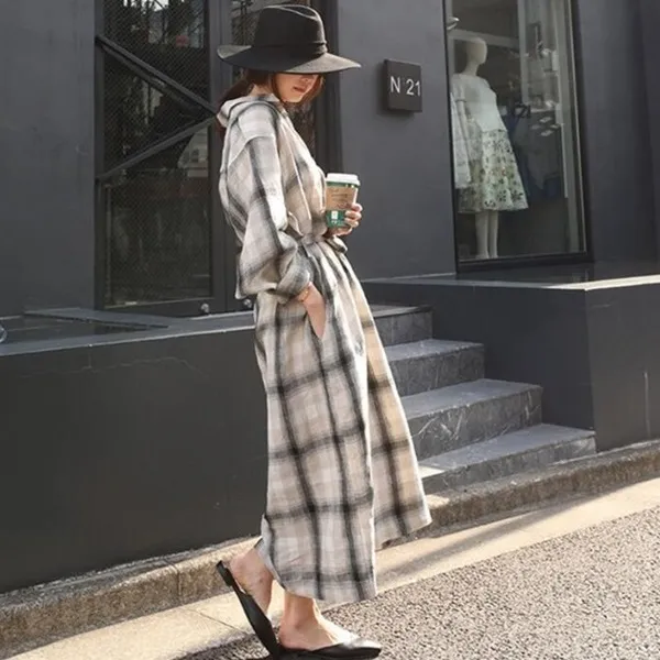 韓版女翻領長袖長款過膝格子襯衫繫帶寬鬆連衣裙