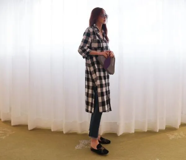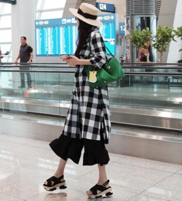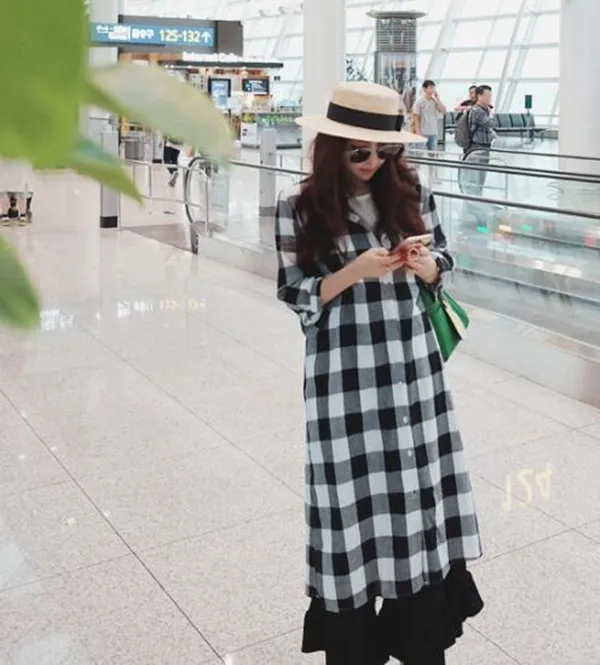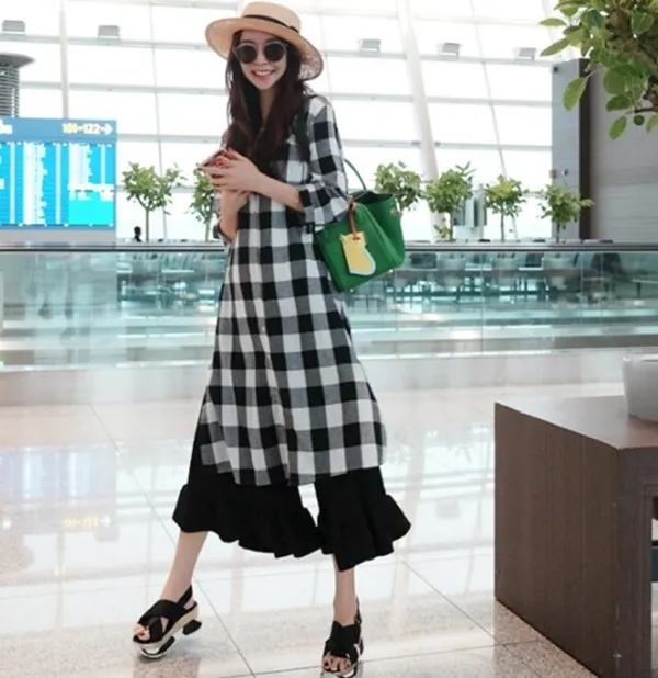 衣都精品-新款韓版五分袖中長款寬鬆大碼大格子襯衫連衣裙