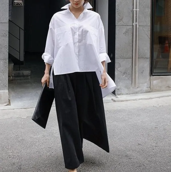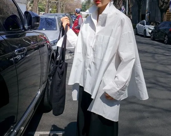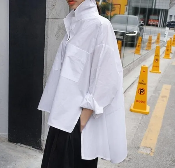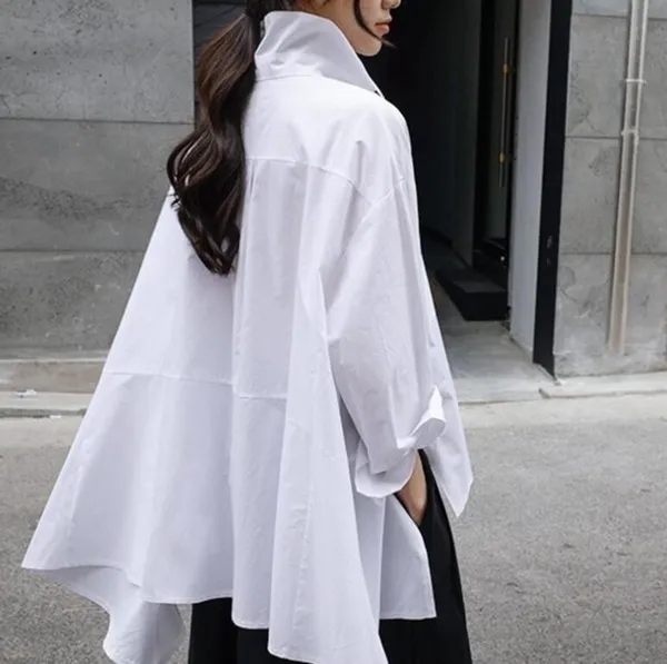 衣都精品-新款白色韓版寬鬆大碼斗篷型長袖不規則襯衣