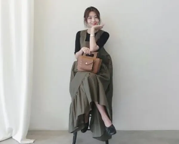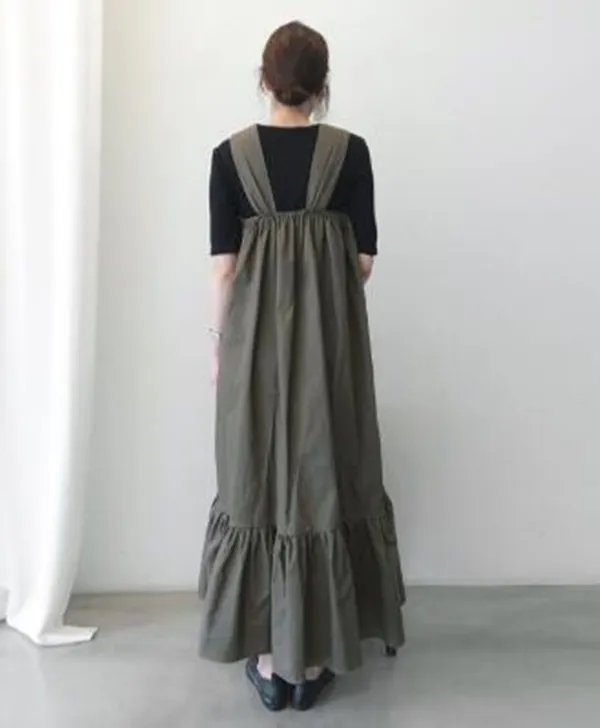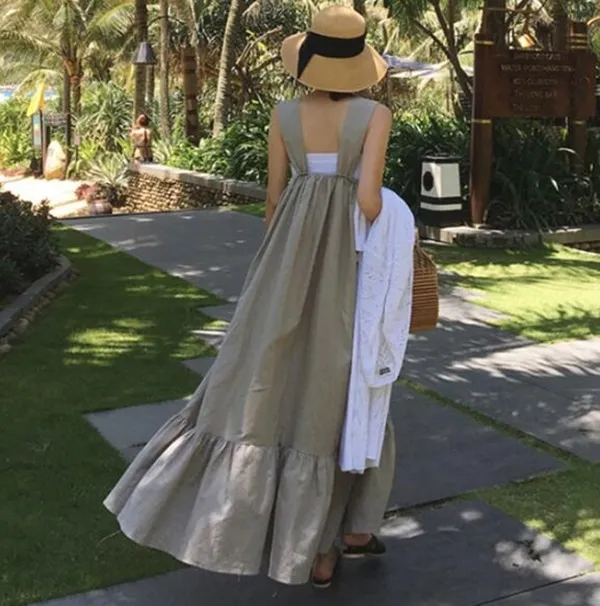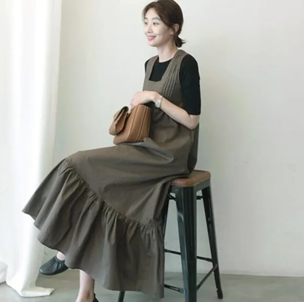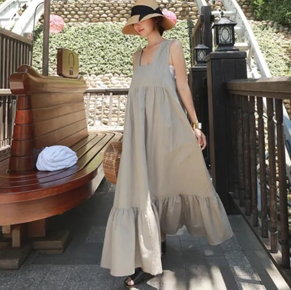 衣都精品-韓版寬鬆大碼過膝長款荷葉邊娃娃裙吊帶裙