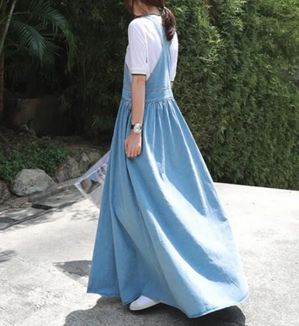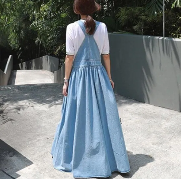 衣都精品-牛仔過膝大擺寬鬆時尚吊帶裙