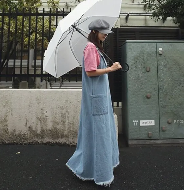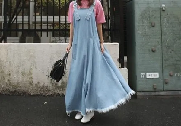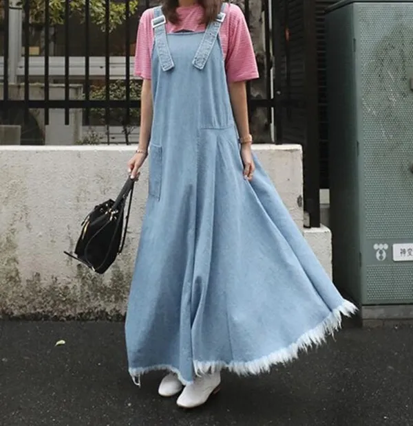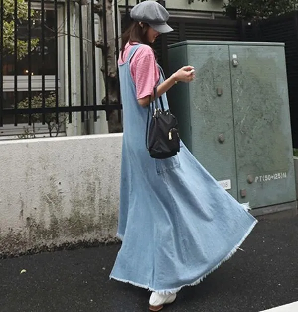 衣都精品-牛仔過膝大擺寬鬆時尚吊帶裙