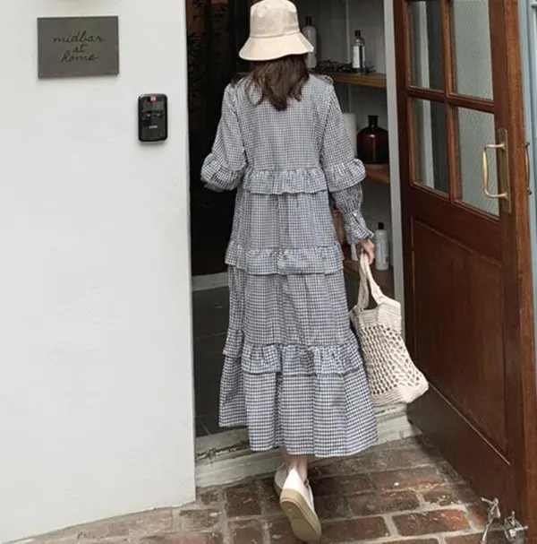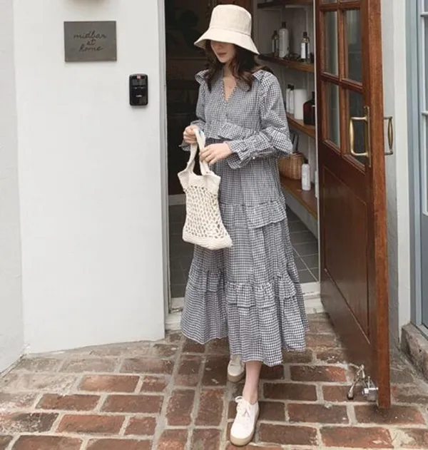 衣都精品-韓版過膝棉麻V領荷葉邊娃娃連衣裙