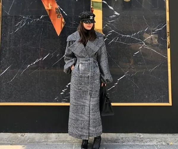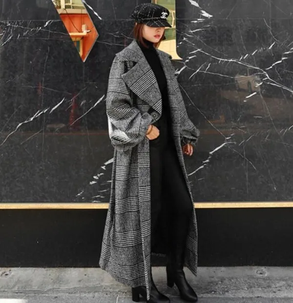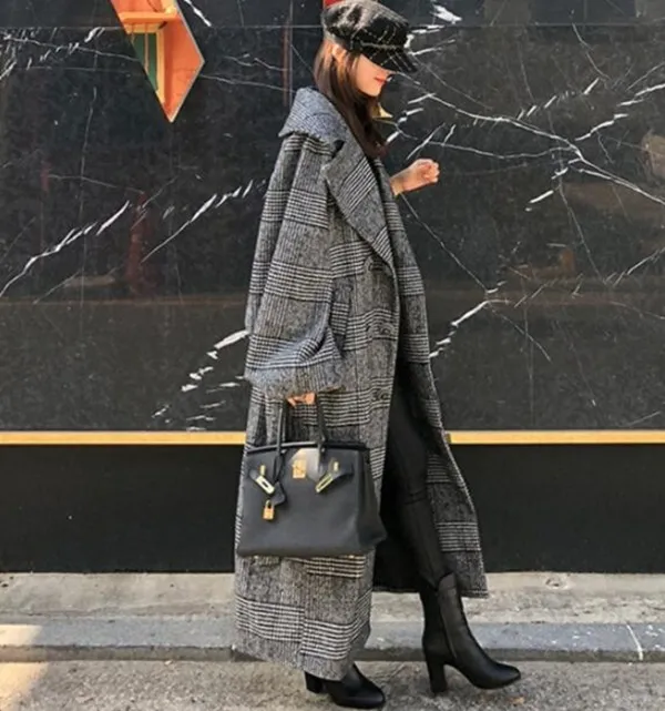 衣都精品-毛呢中長款新款韓版寬鬆雙排扣系帶千鳥格外套