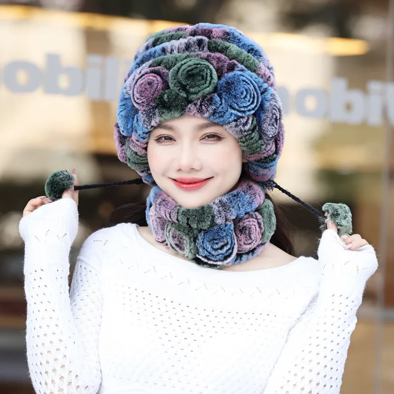 衣都精品- 2022冬季新款時尚保暖獺兔毛花朵帽子圍巾兩件式套裝