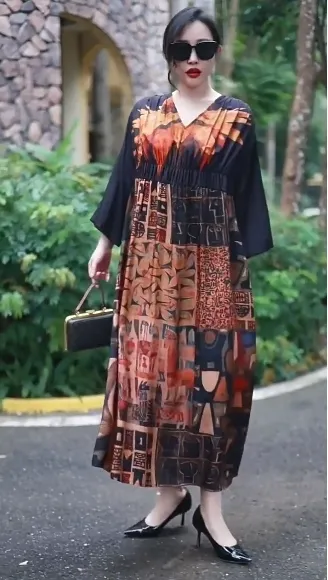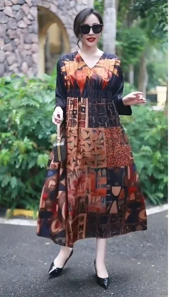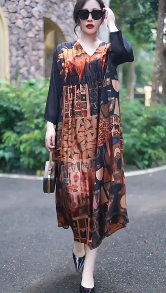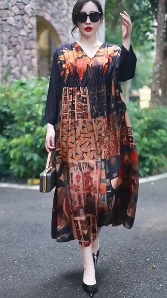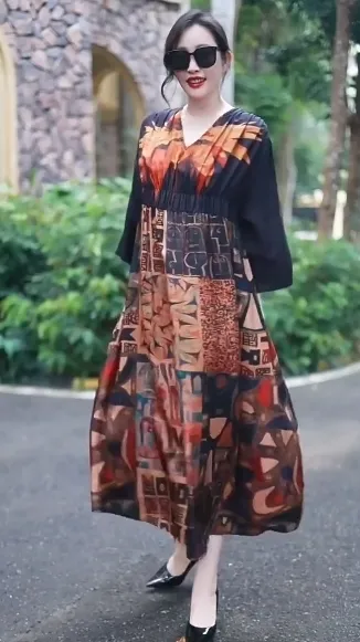 衣都精品- 2023新款復古V領寬鬆顯瘦大碼氣質連衣裙
