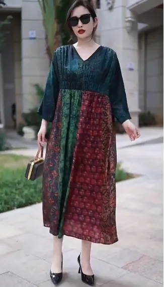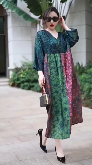 衣都精品- 2023新款復古V領寬鬆顯瘦大碼氣質連衣裙
