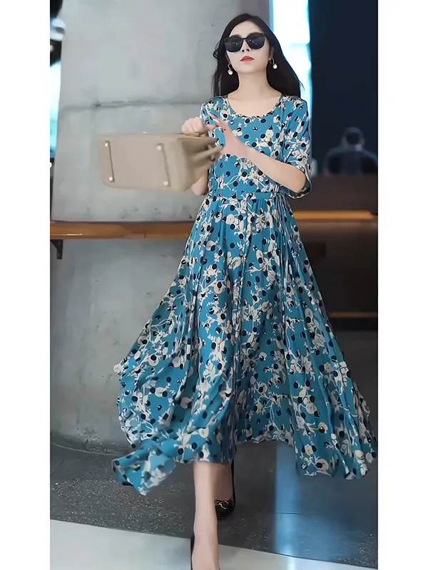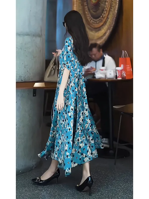 衣都精品- 2023新款氣質印花拼接優雅寬鬆大擺連衣裙