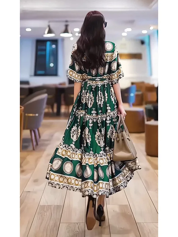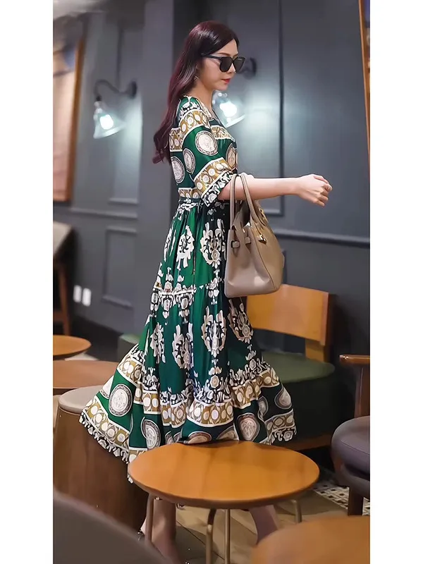 衣都精品- 新款氣質印花短袖圓領輕奢連衣裙
