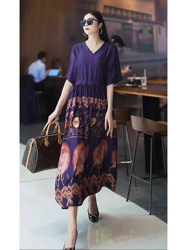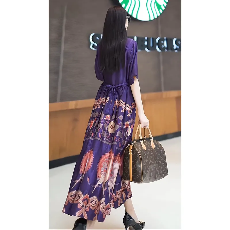 衣都精品- 新款氣質印花短袖圓領輕奢連衣裙