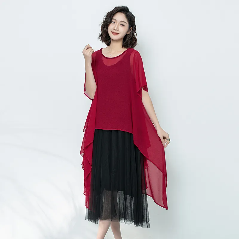 衣都精品- 新款大碼寬鬆拼接不規則蝙蝠袖印花連衣裙