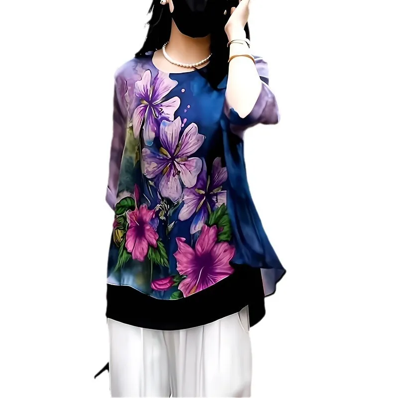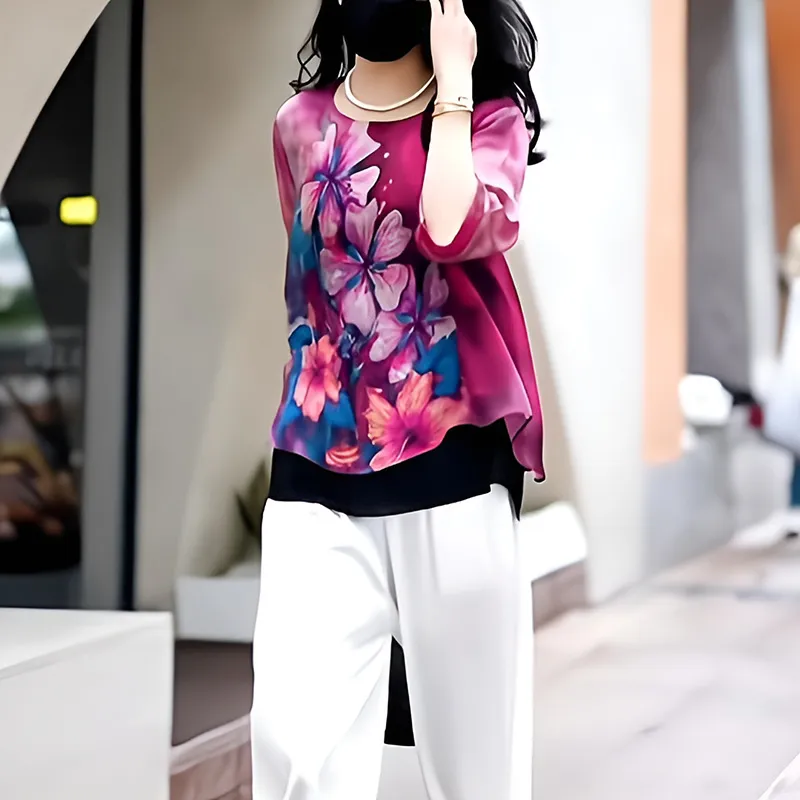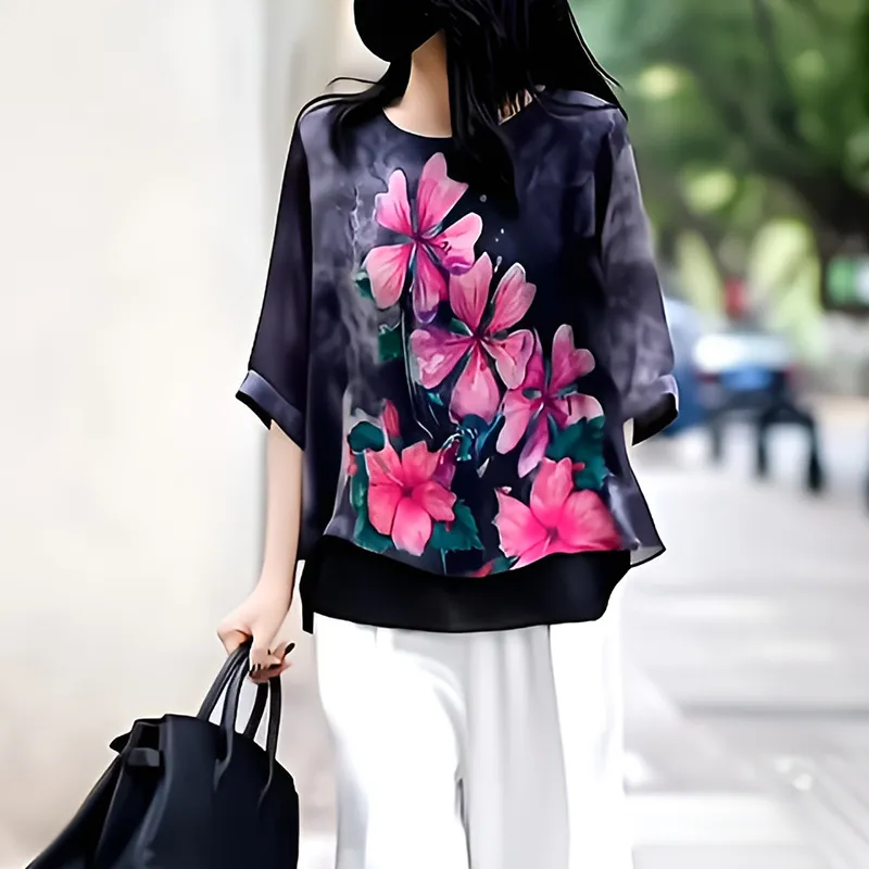 衣都精品- 新款高級緞面印花氣質寬鬆遮肉上衣