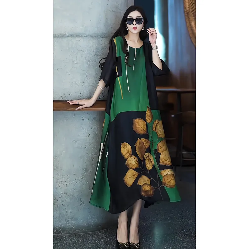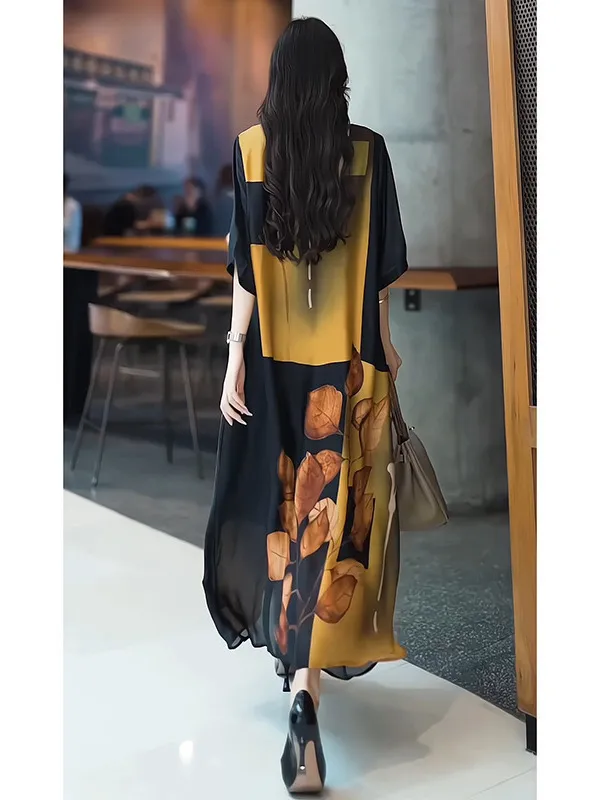 衣都精品- 新款寬鬆大碼真絲印花遮肉顯瘦連衣裙