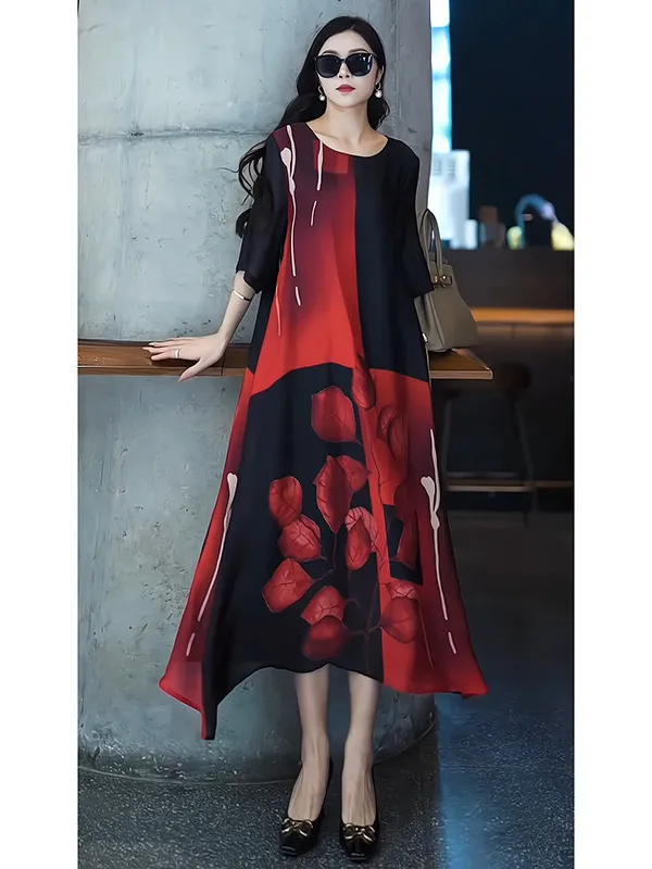 衣都精品- 新款寬鬆遮肚顯瘦絲質緞面印花連衣裙