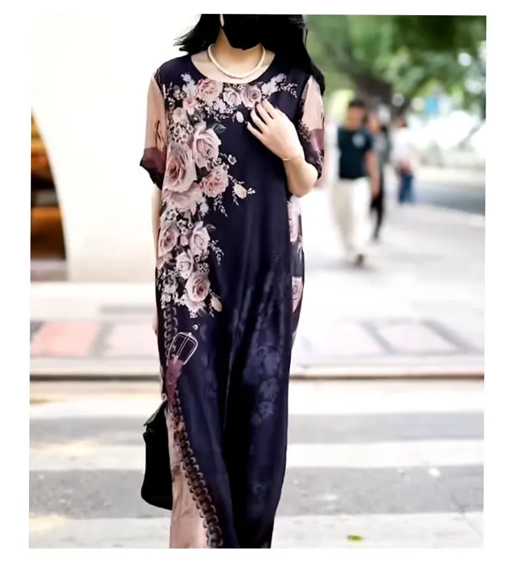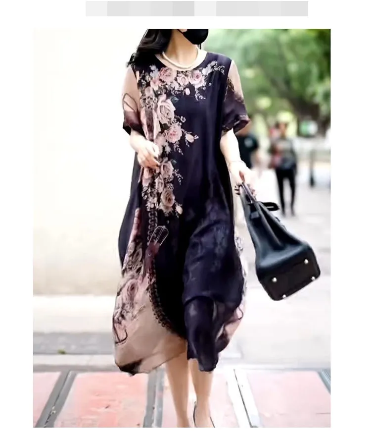 衣都精品- 新款寬鬆大碼真絲印花遮肉顯瘦連衣裙