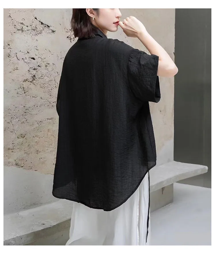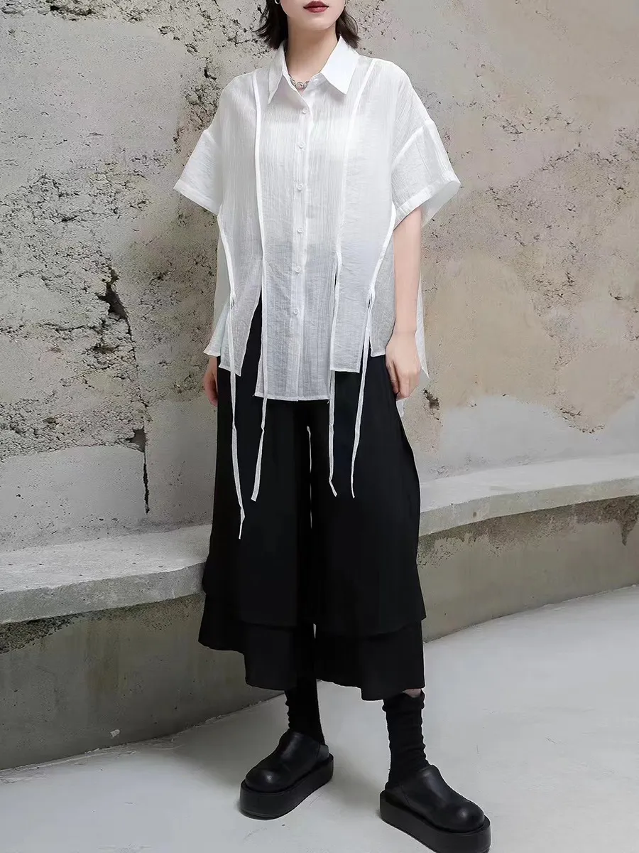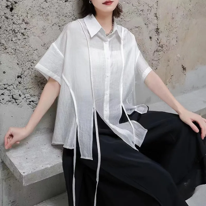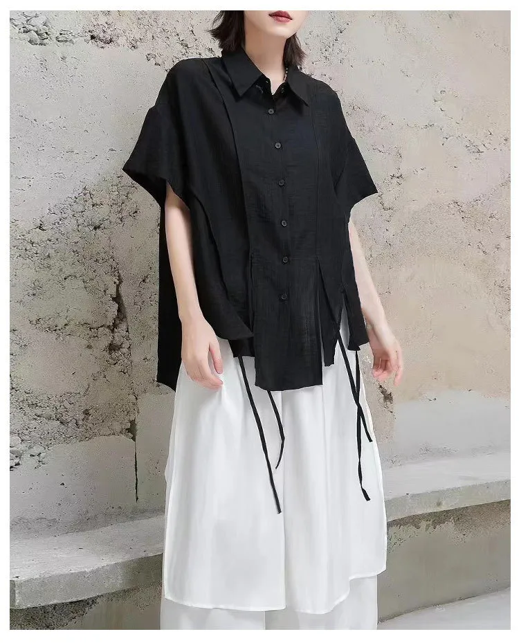 衣都精品- 新款設計感綁帶顯瘦大碼天絲不規則上衣