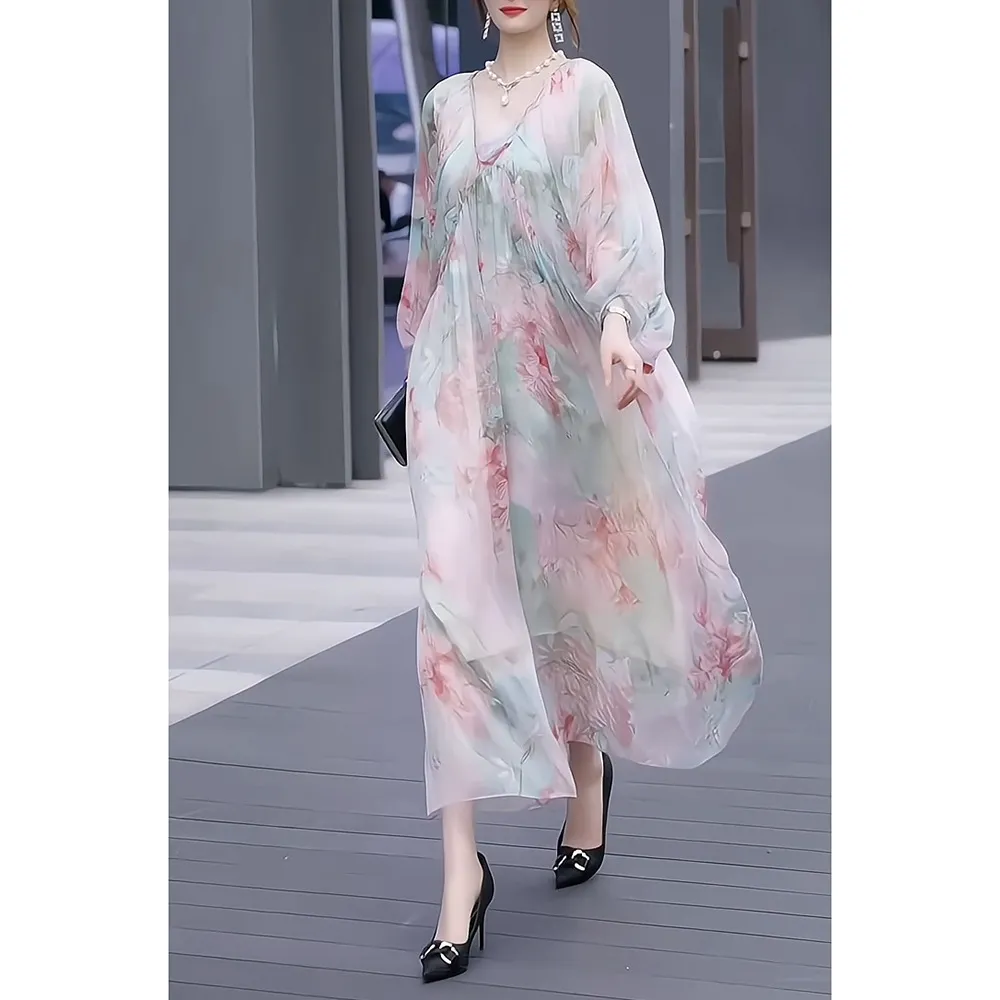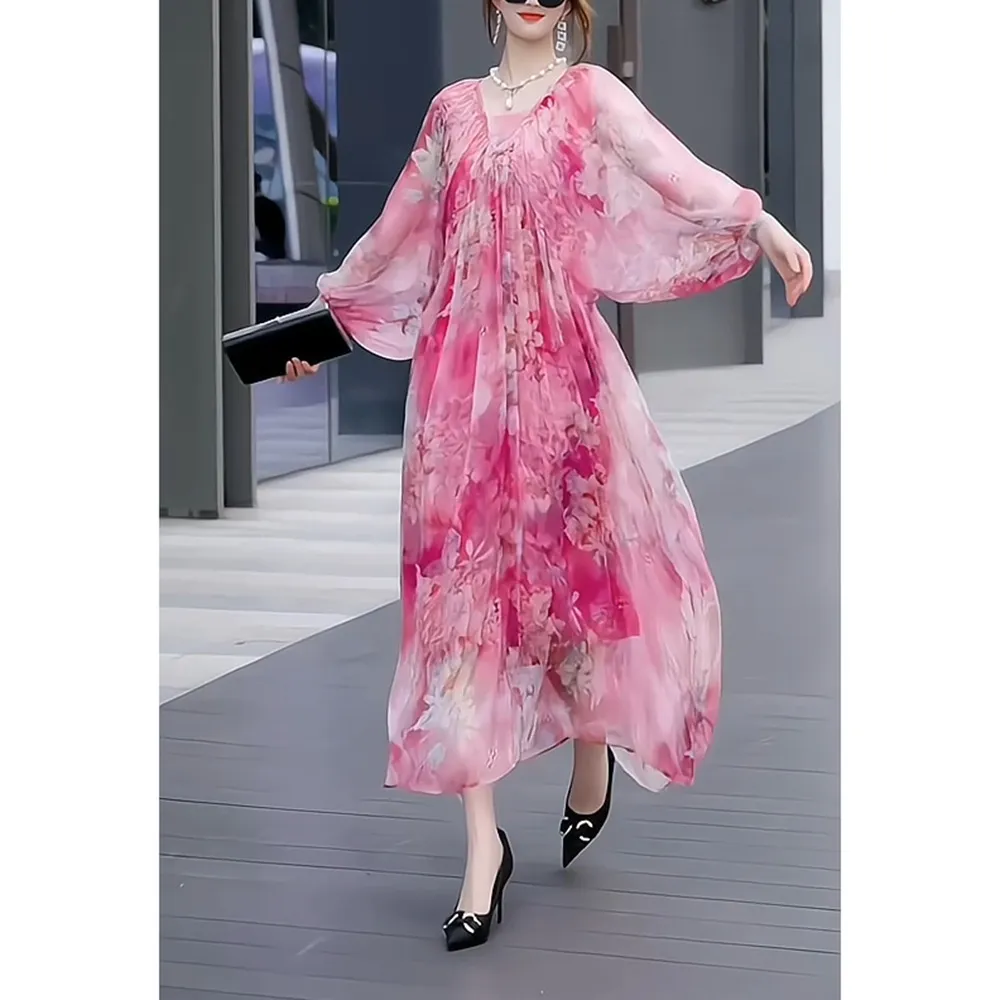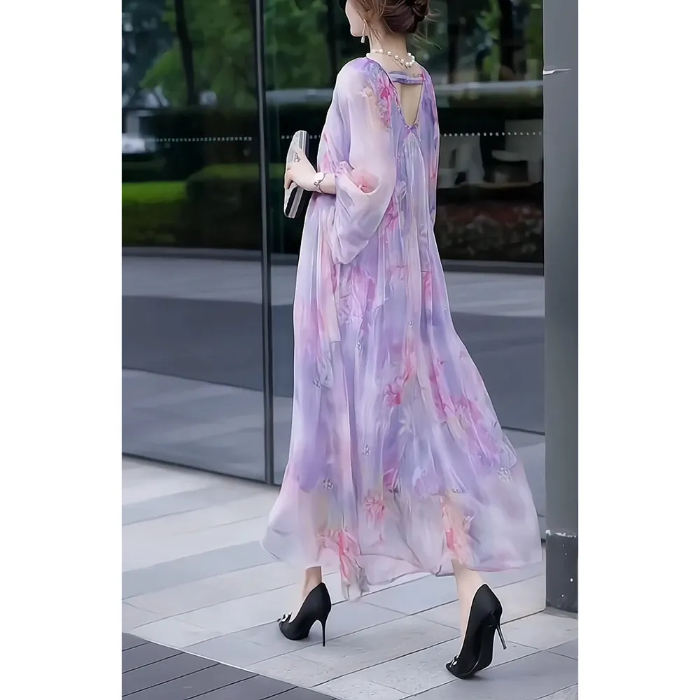 衣都精品- 新款超顯瘦氣質拼接印花九分袖長款連衣裙