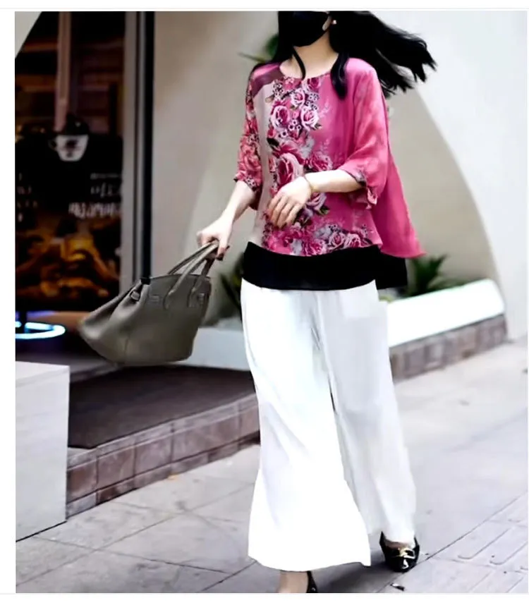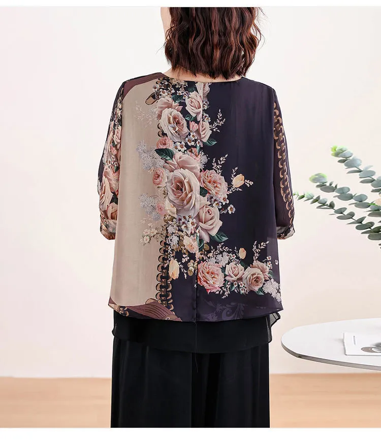 衣都精品- 新款氣質大碼七分袖真絲緞面印花上衣