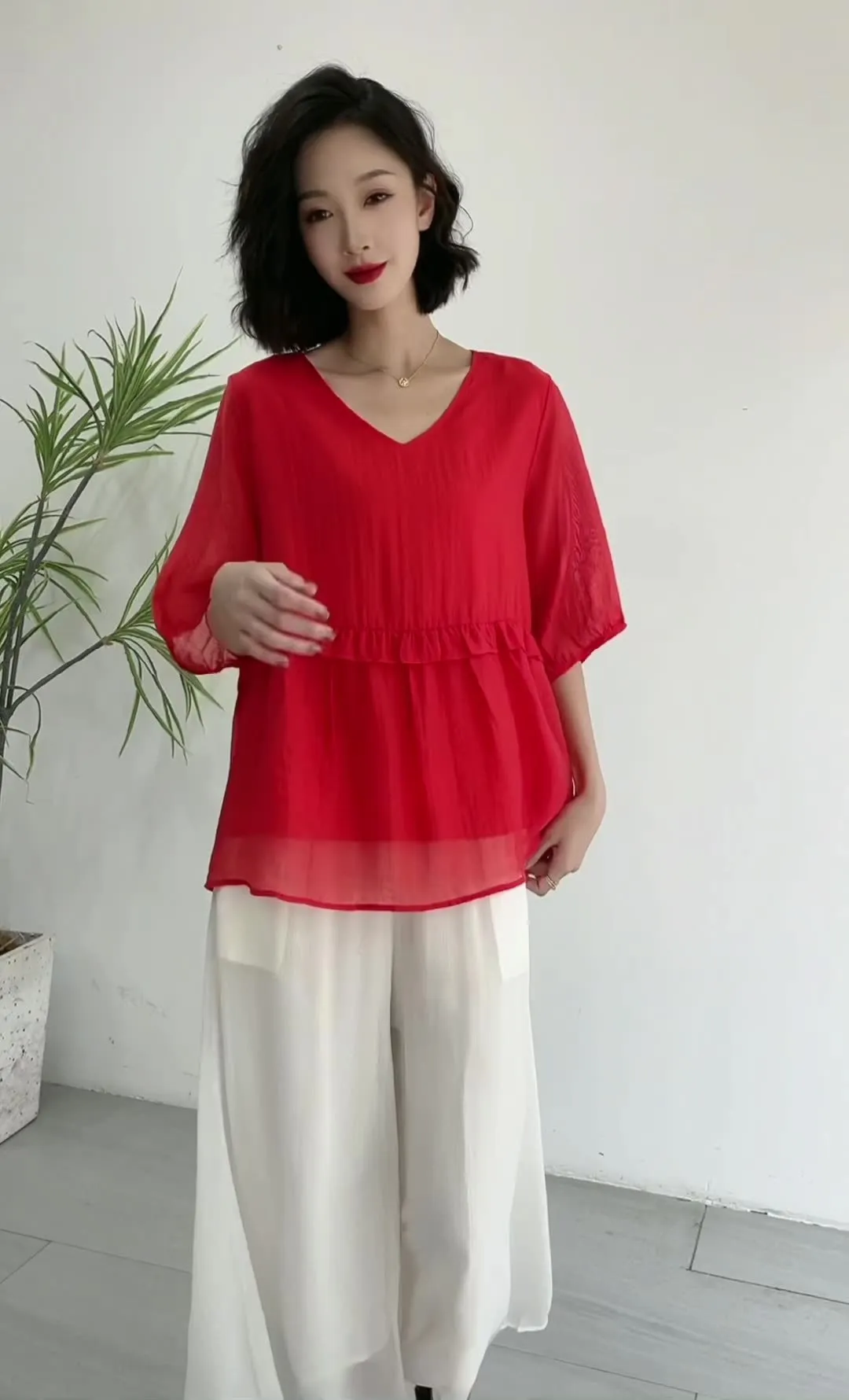 衣都精品- 新款氣質大碼七分袖真絲緞面印花上衣