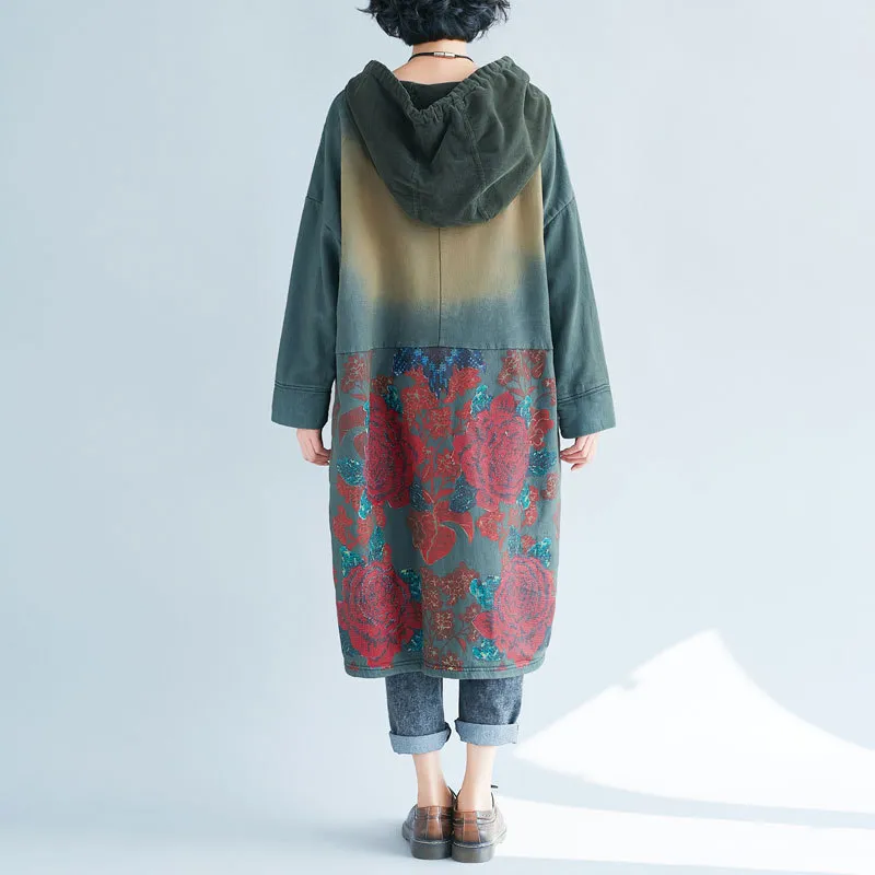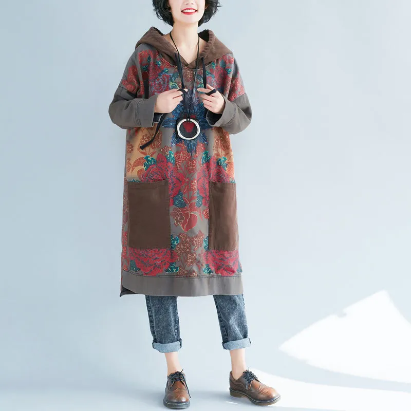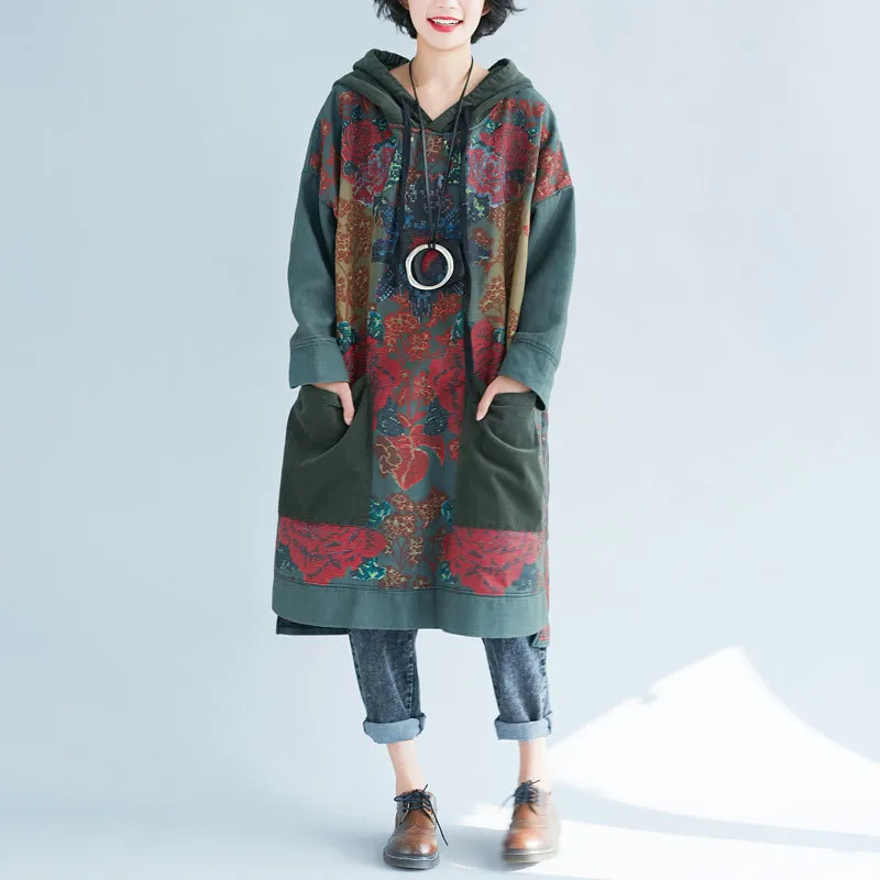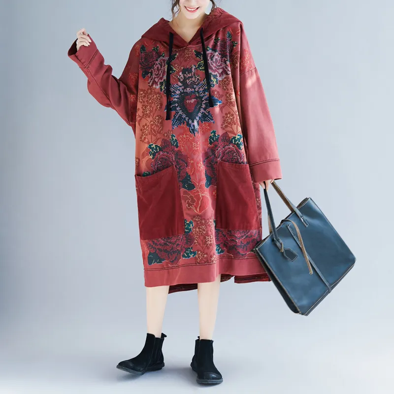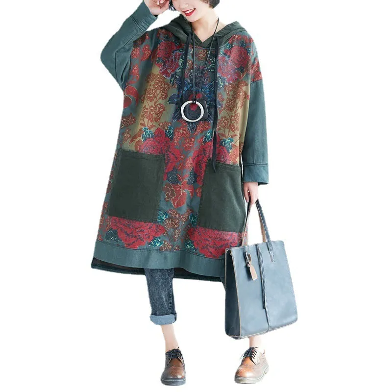 衣都精品- 新款民族風印花大碼連帽中長款連衣裙