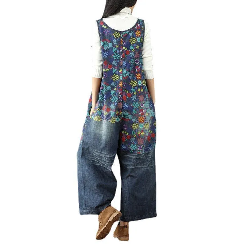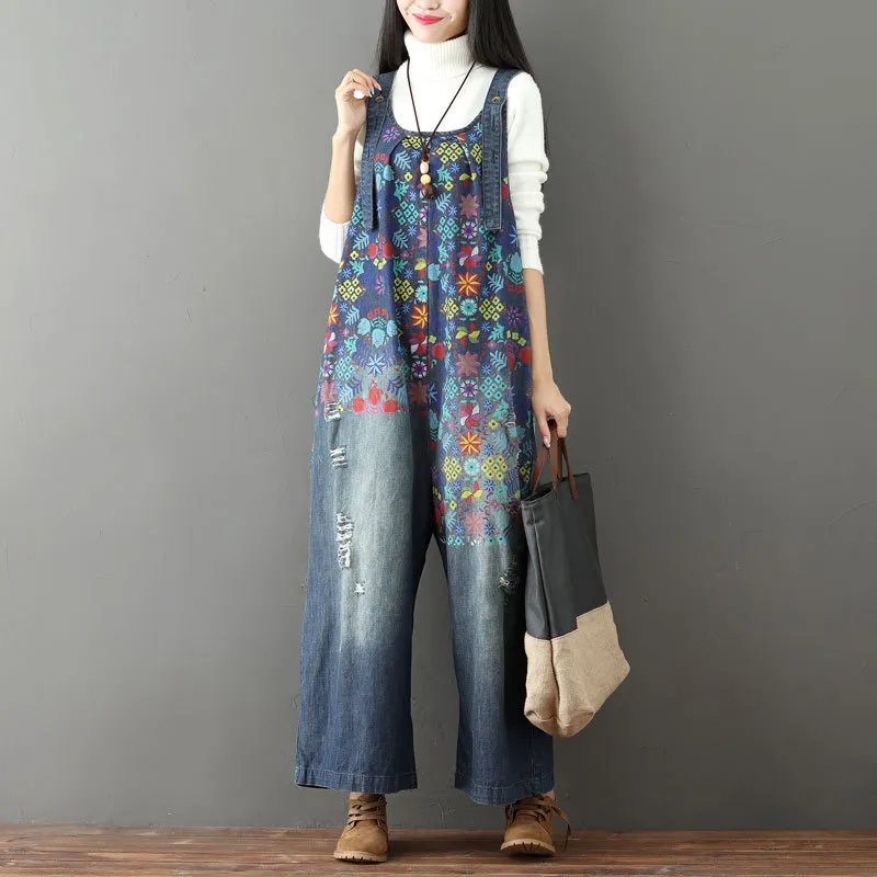衣都精品- 新款大碼印花牛仔磨白破洞吊帶闊腿褲