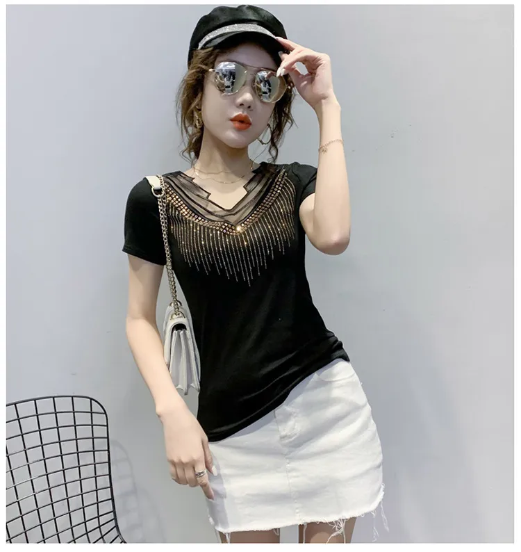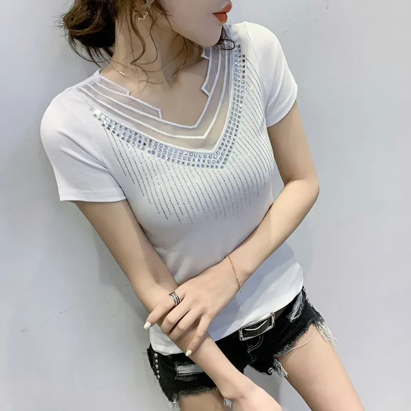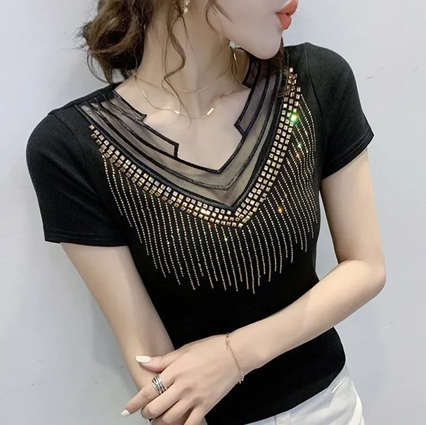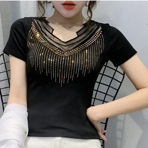 衣都精品- 2021春季新款網紗拼接鑲鑽上衣