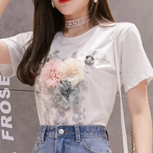衣都精品- 2021春季新款圓領3D立體小花朵上衣