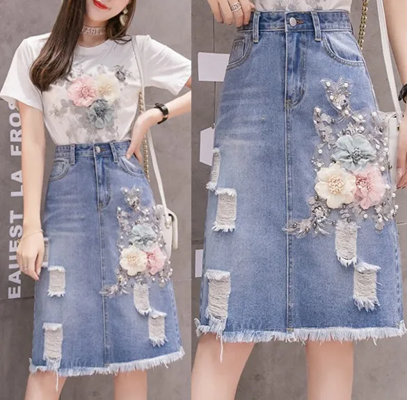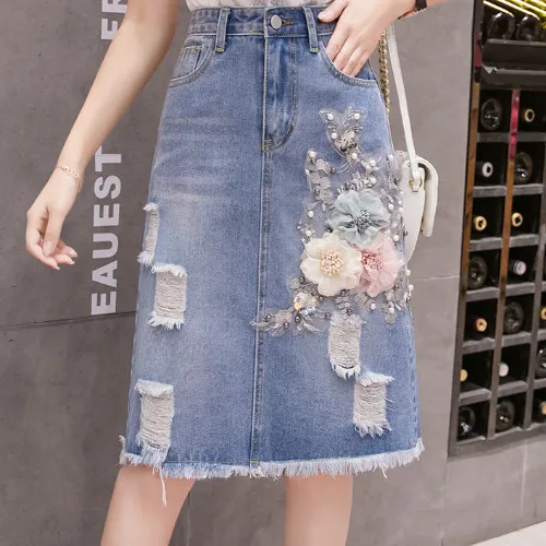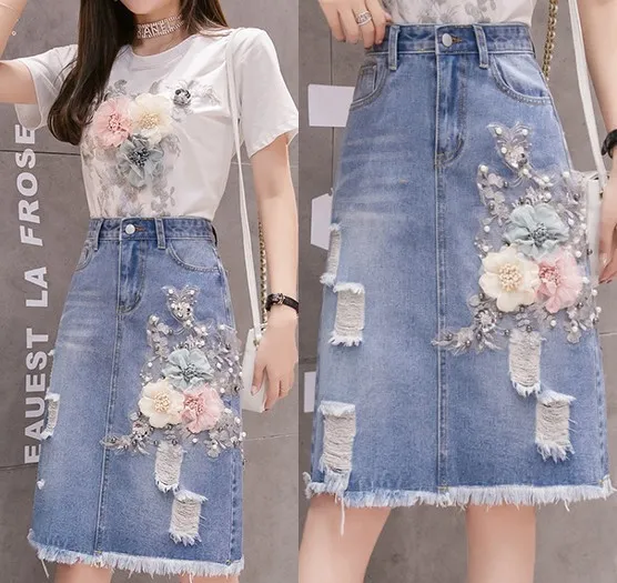 衣都精品- 2021春季新款磨破立體花朵牛仔裙