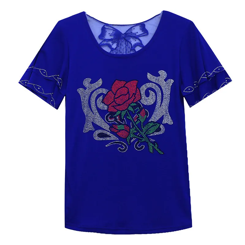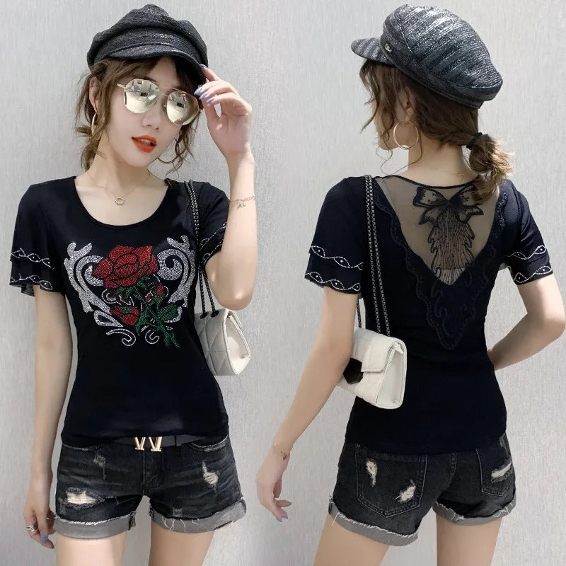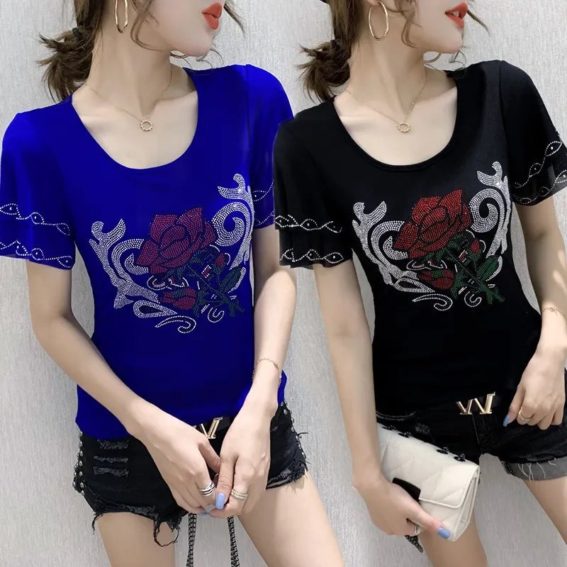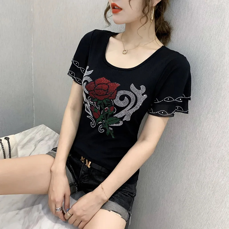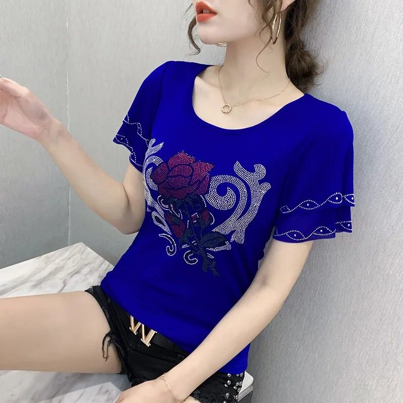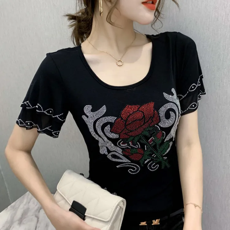 衣都精品- 2021春季新款燙鑽荷葉邊袖圓領上衣