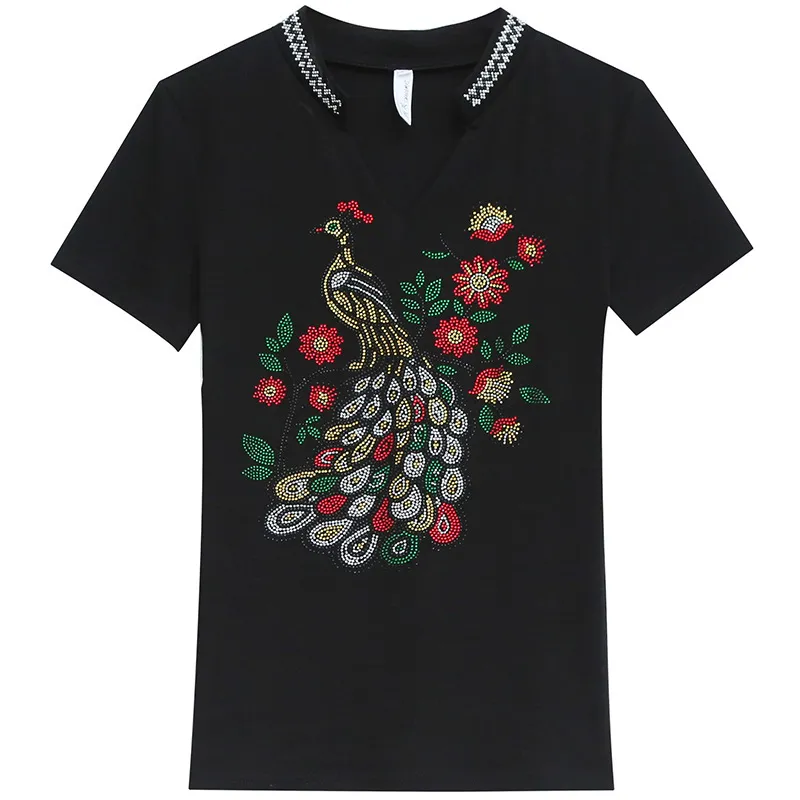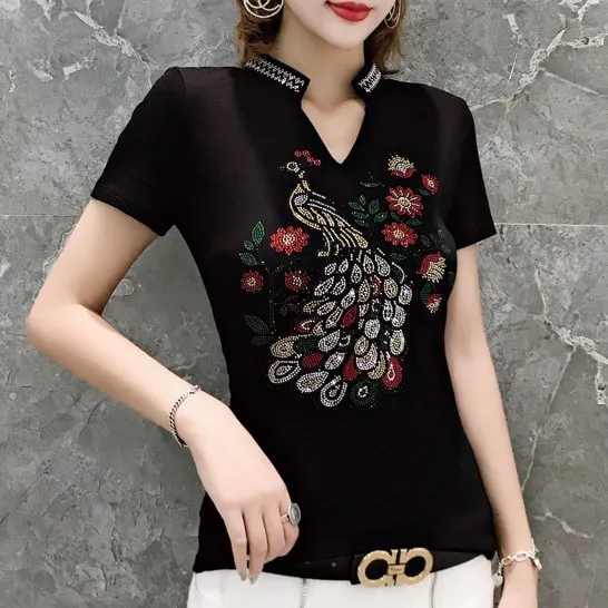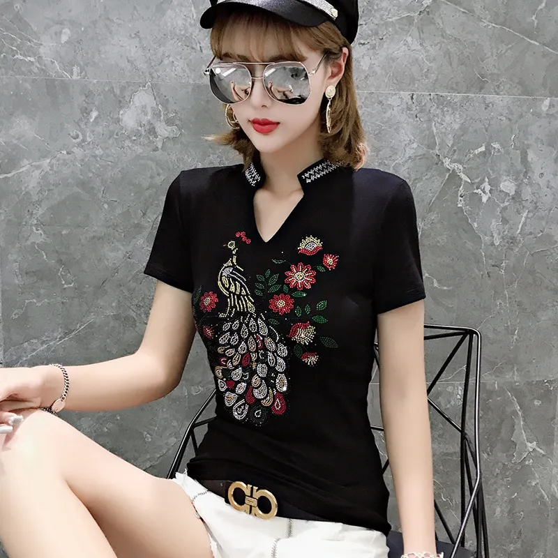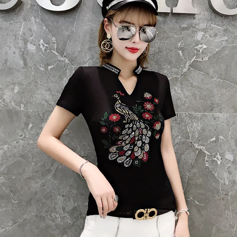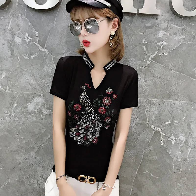 衣都精品- 2021秋季新款民族風燙鑽孔雀立領上衣