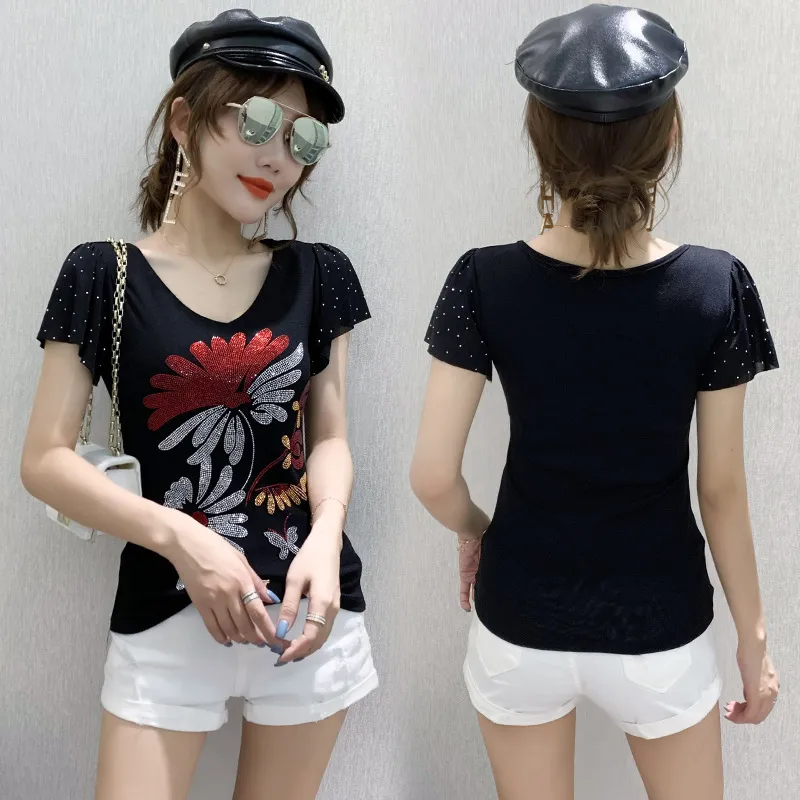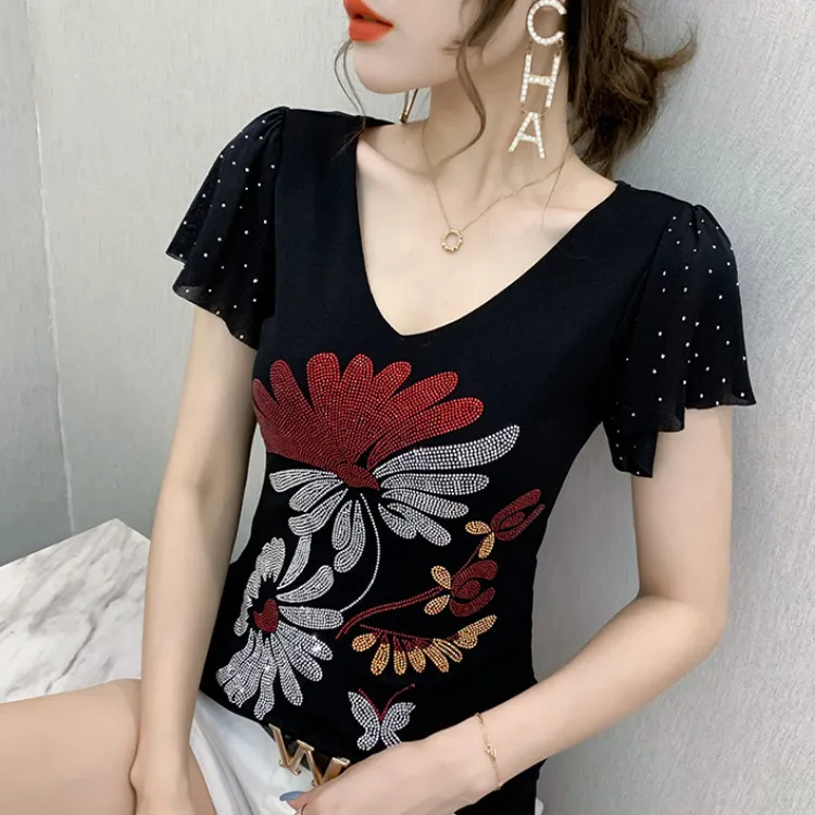 衣都精品- 2021春季新款燙鑽荷葉邊袖圓領上衣