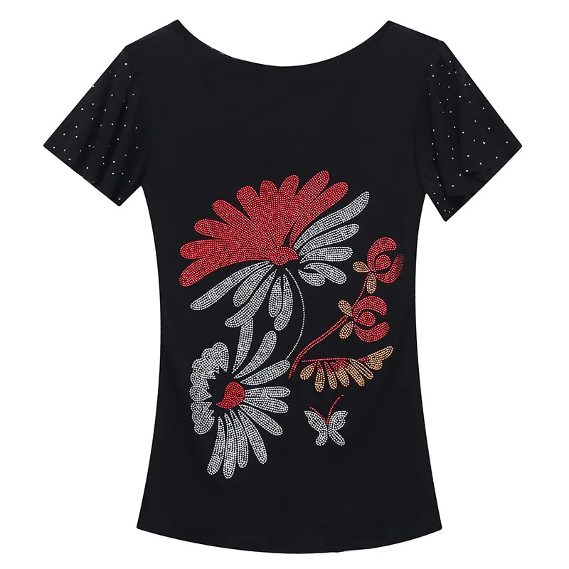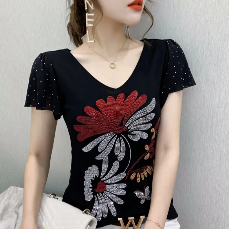 衣都精品- 2022春季新款歐版大碼鑲鑽大花朵喇叭袖上衣