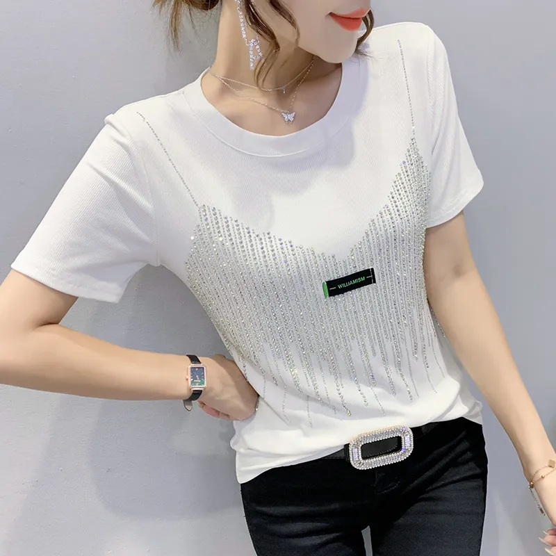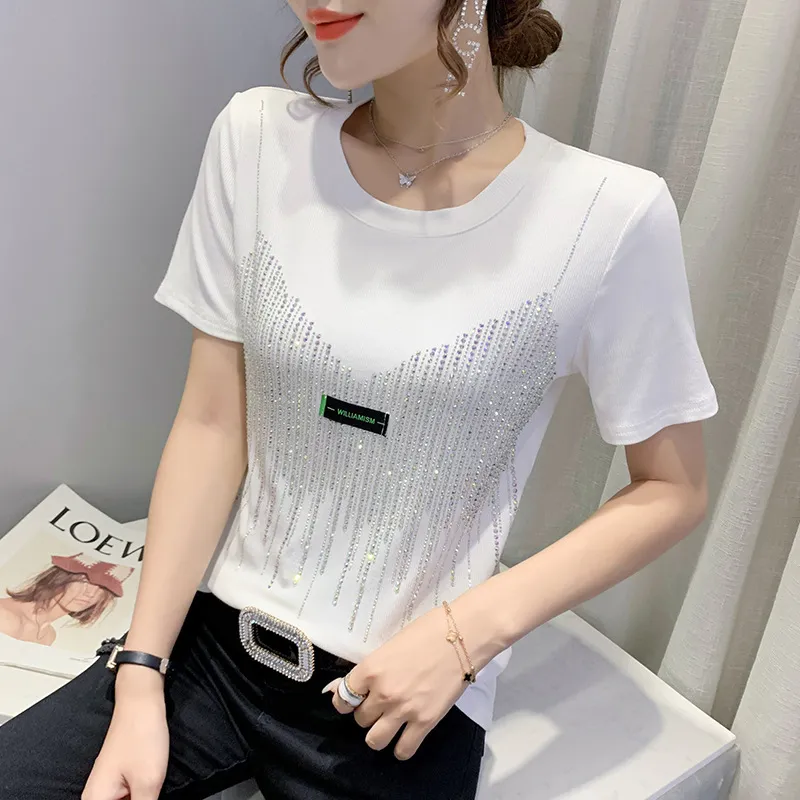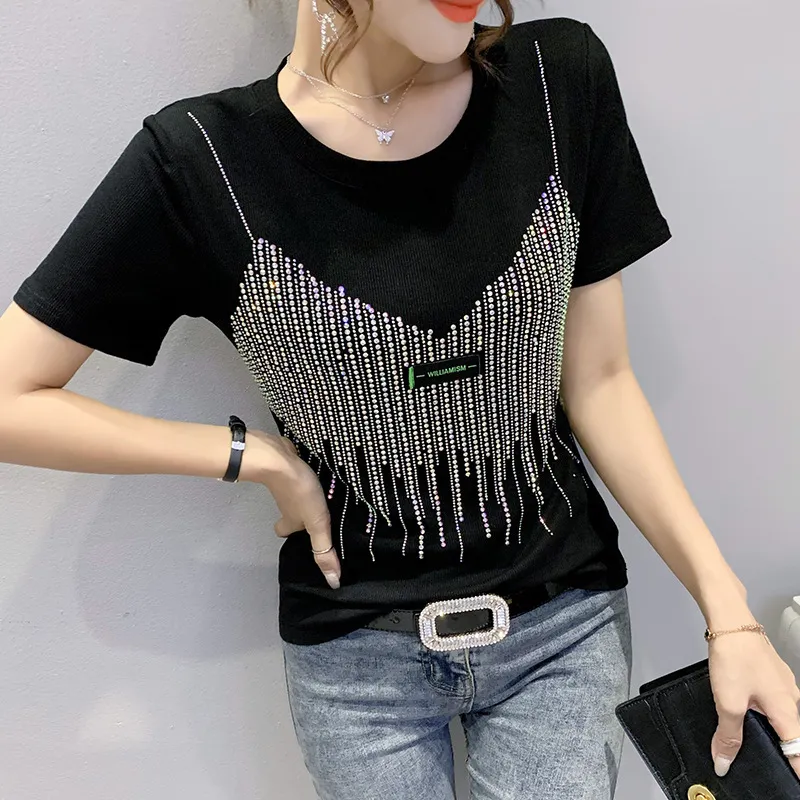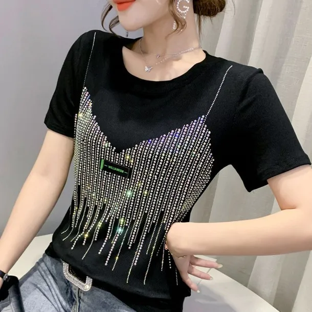 衣都精品- 2022春夏新款樹葉鏤空燙鑽短袖露鎖骨上衣