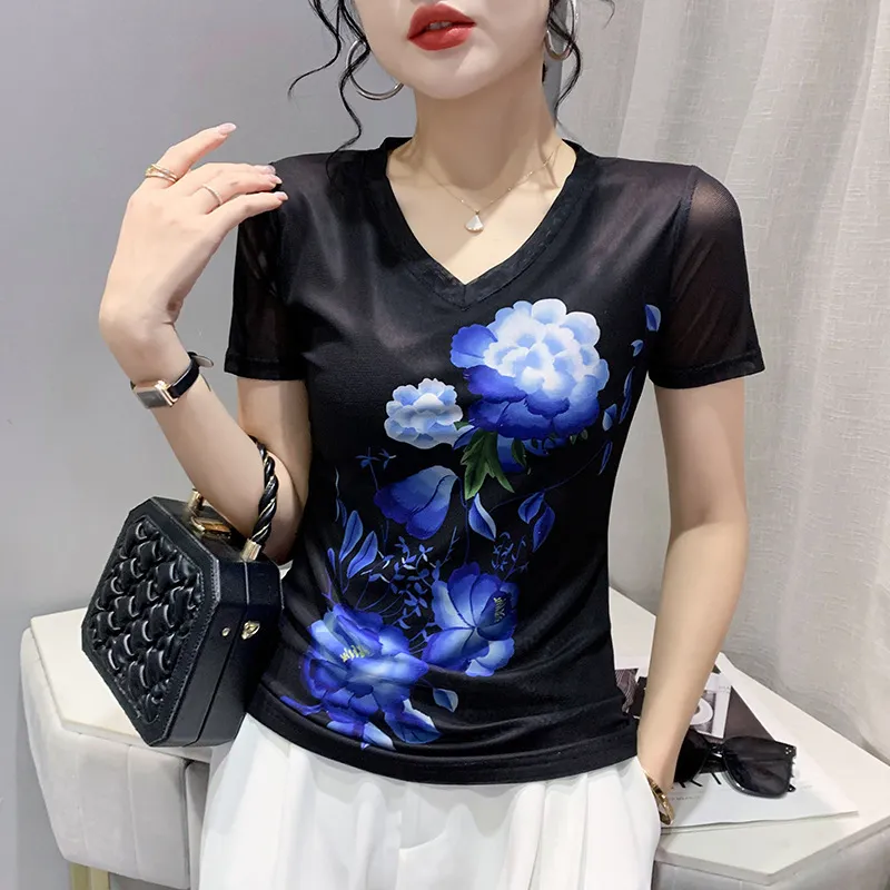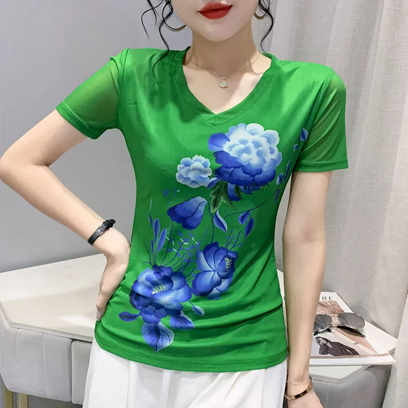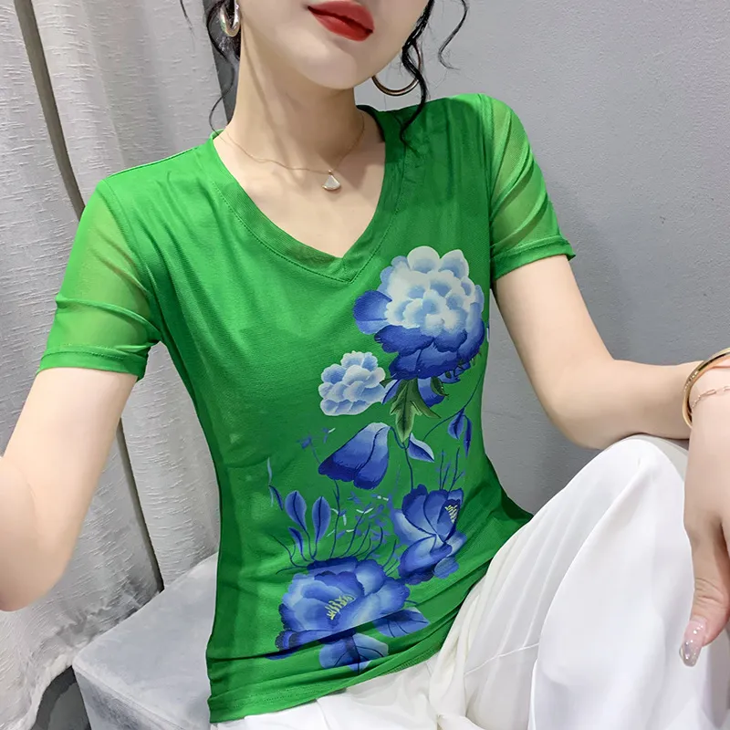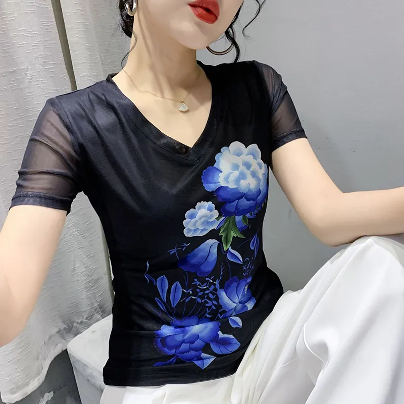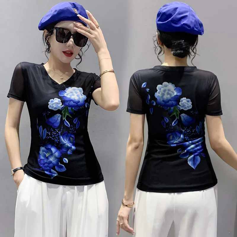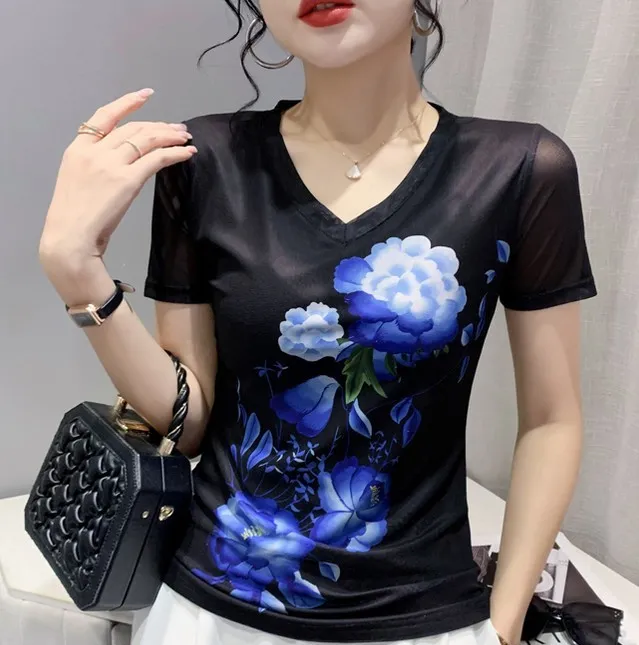 衣都精品- 2022春夏新款網紗短袖數碼印花透氣上衣