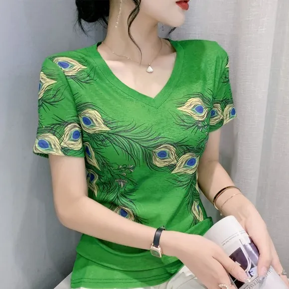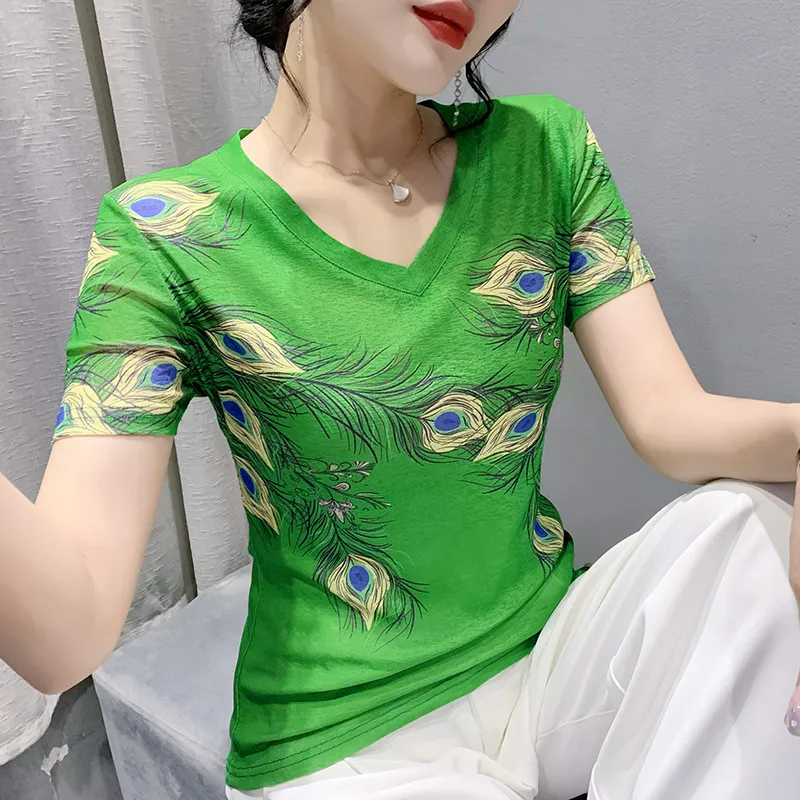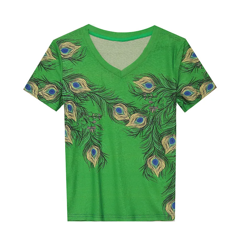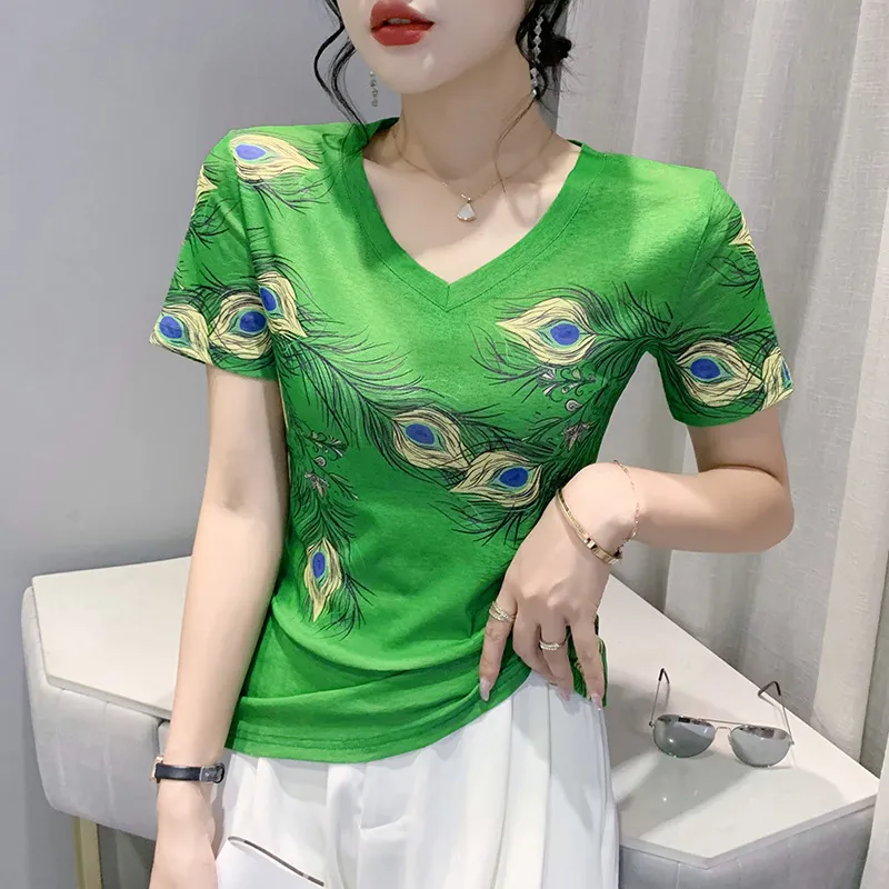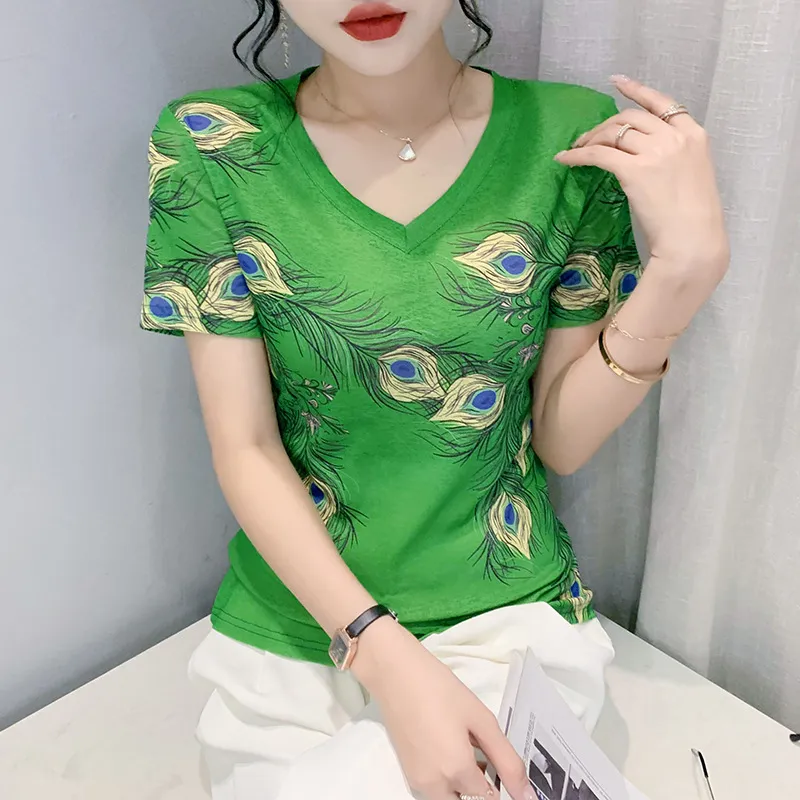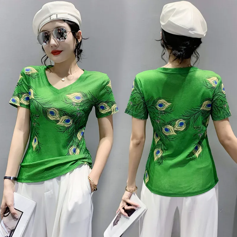 衣都精品- 2022春夏新款數碼印花小清新綠色羽毛上衣