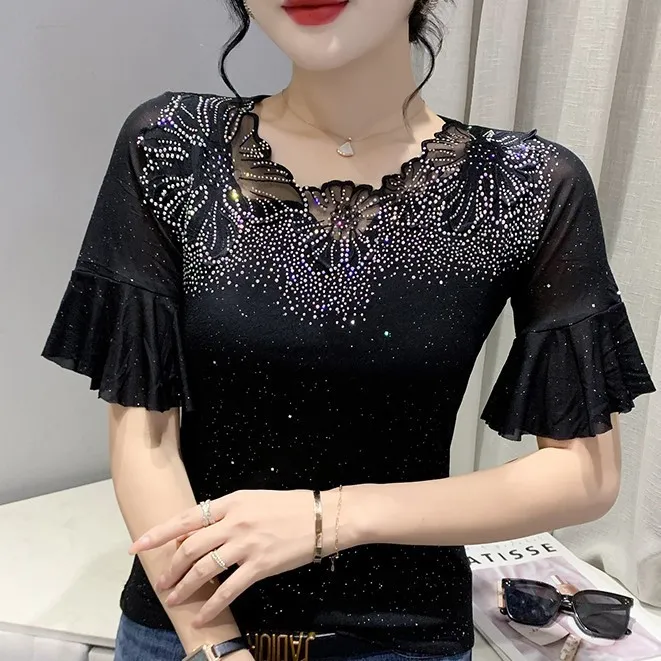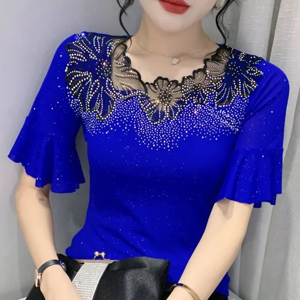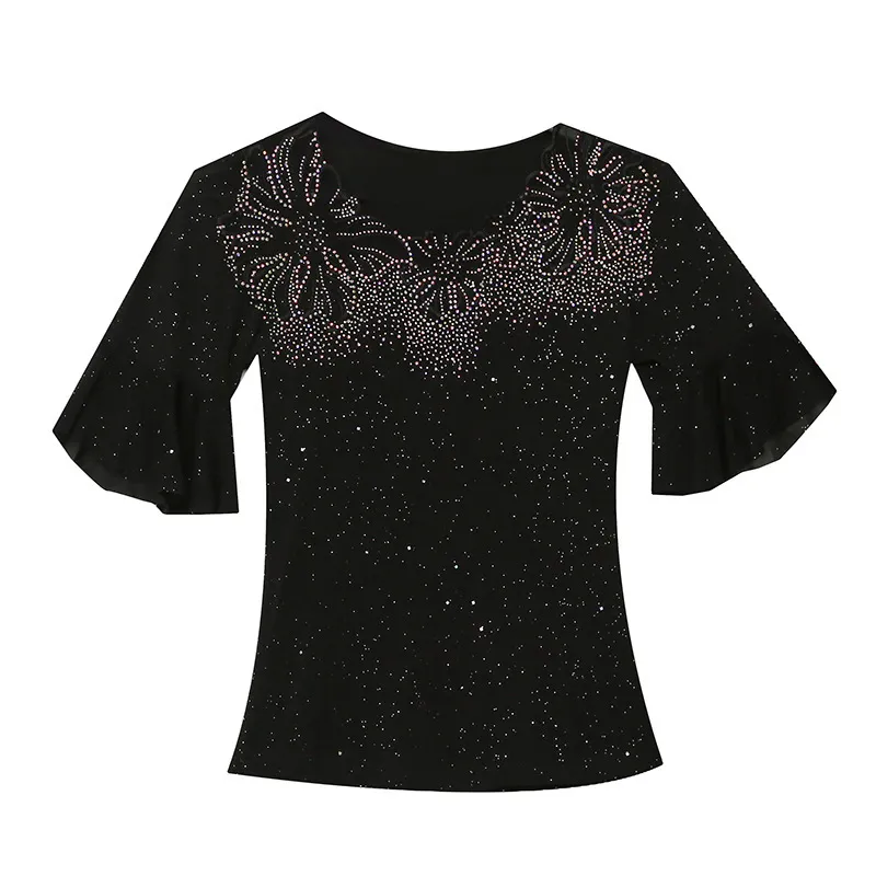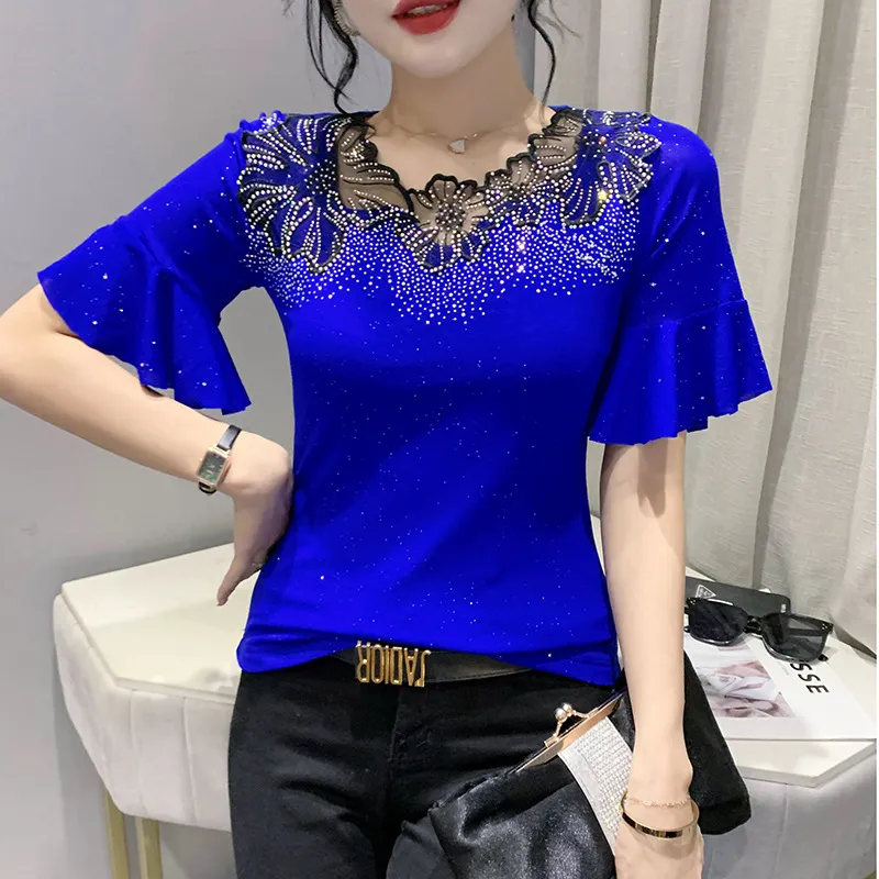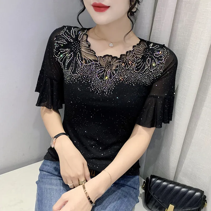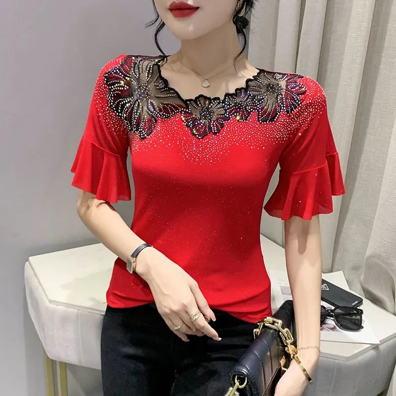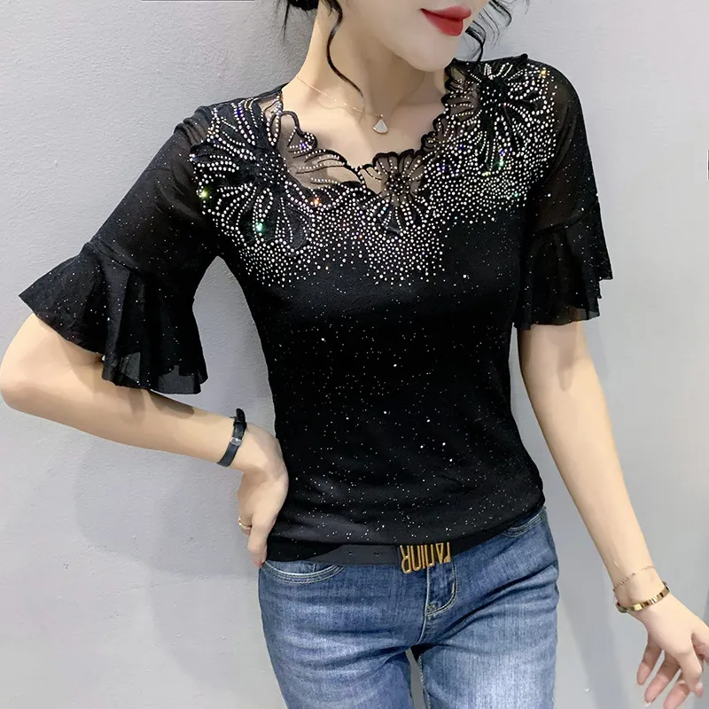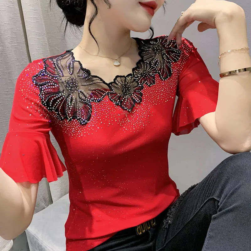衣都精品- 2022春夏新款蕾絲花朵帶鑽透視喇叭袖上衣