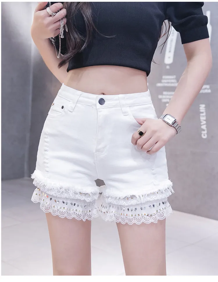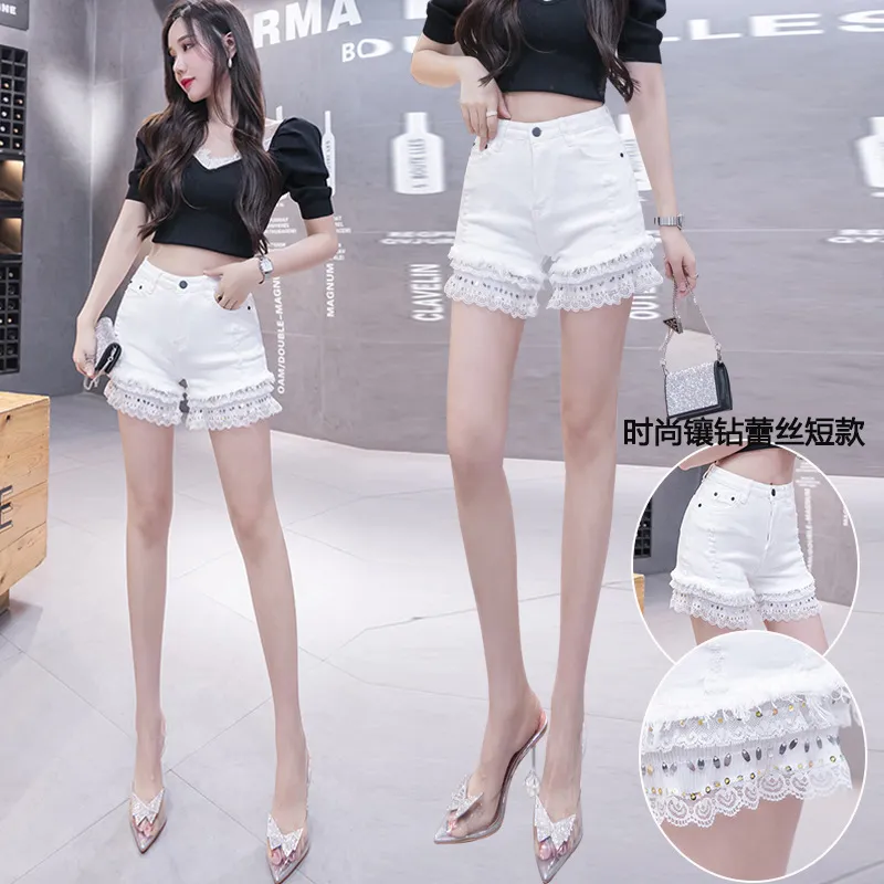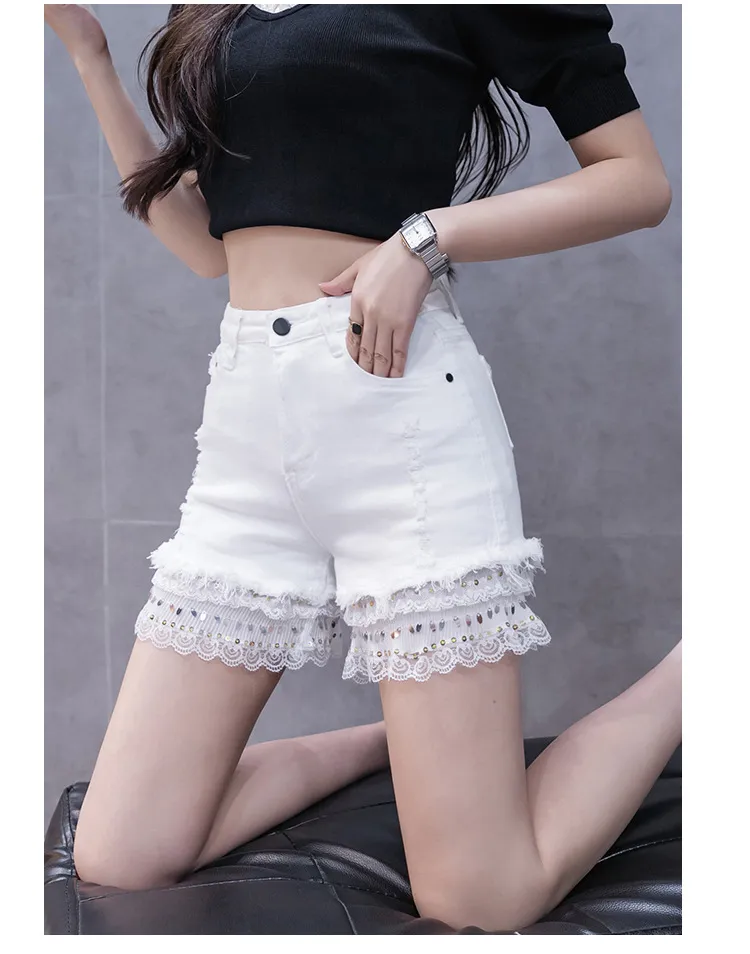衣都精品- 2022秋季新款歐版重工亮片花邊蕾絲拼接直筒熱褲