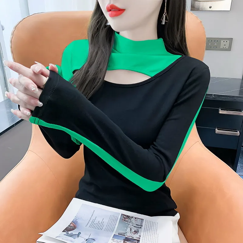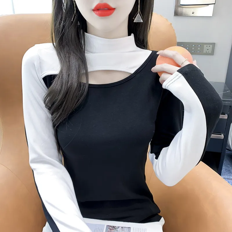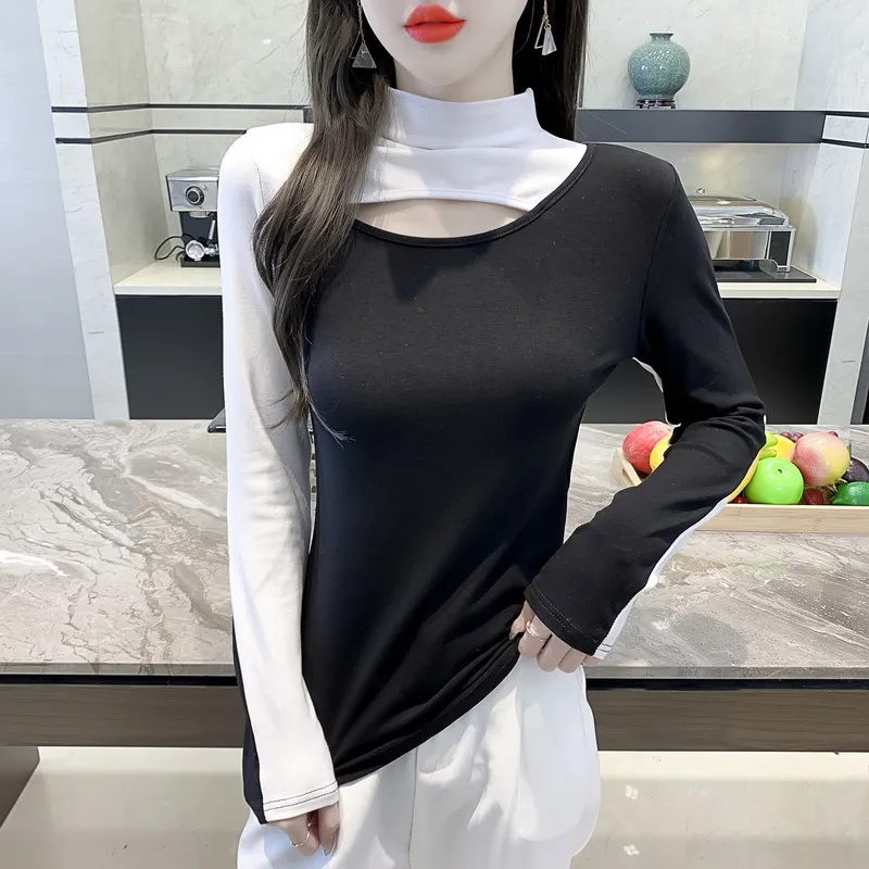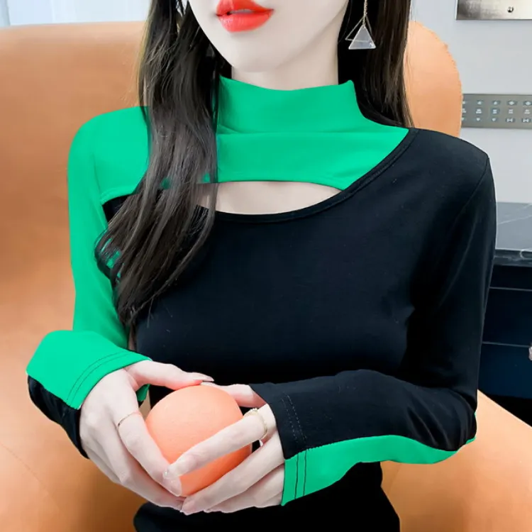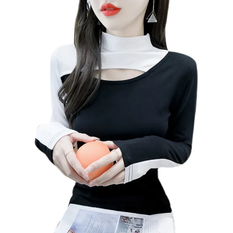 衣都精品- 2022冬季新款小清新拼接半高領鏤空撞色上衣