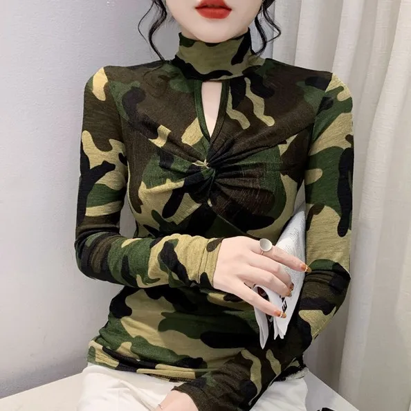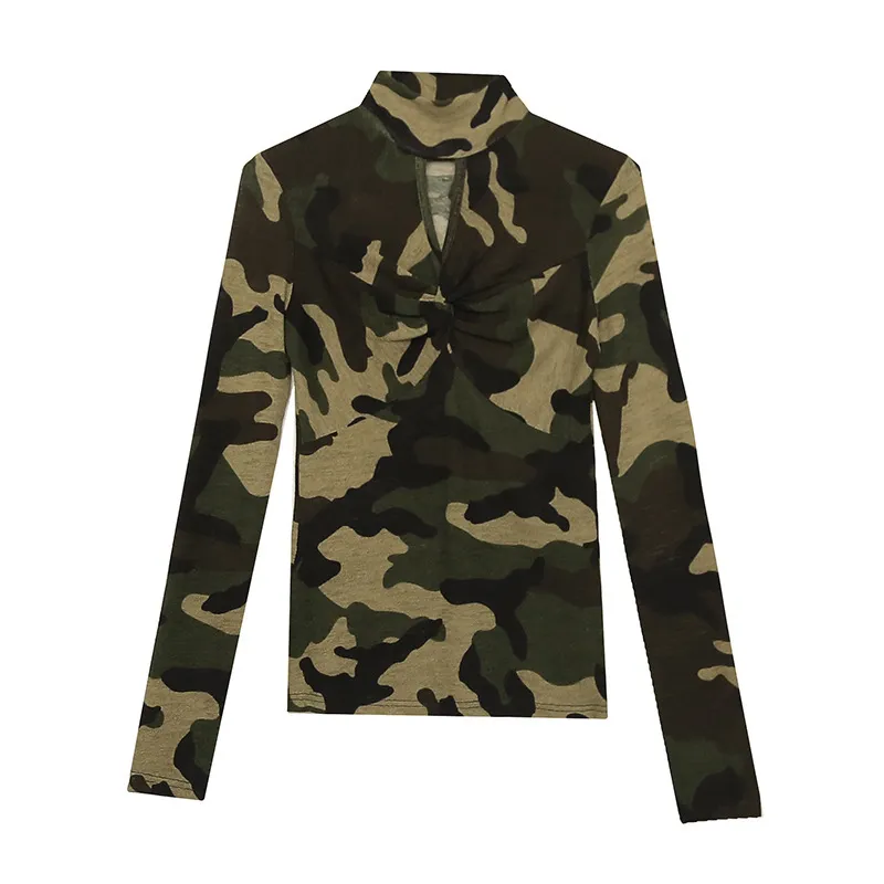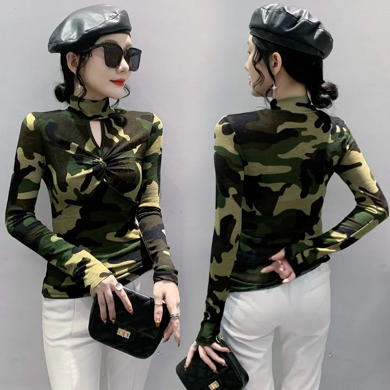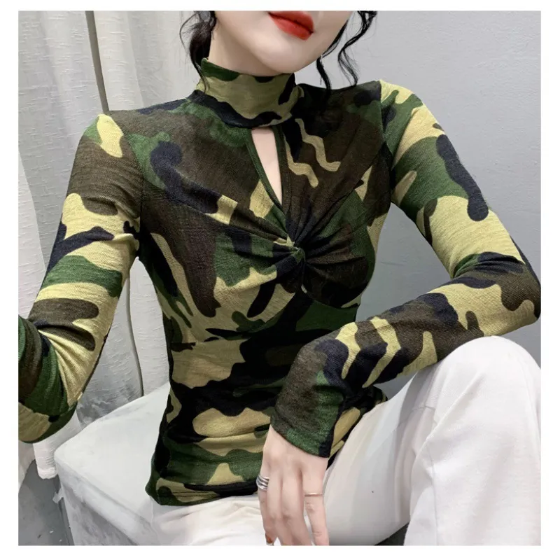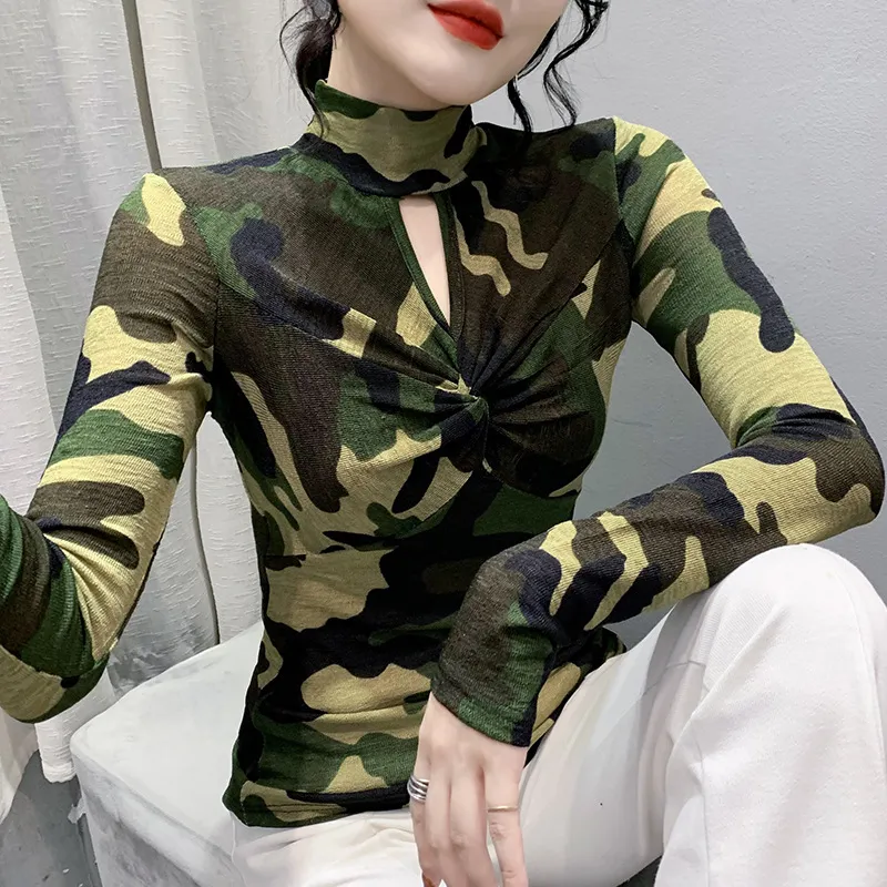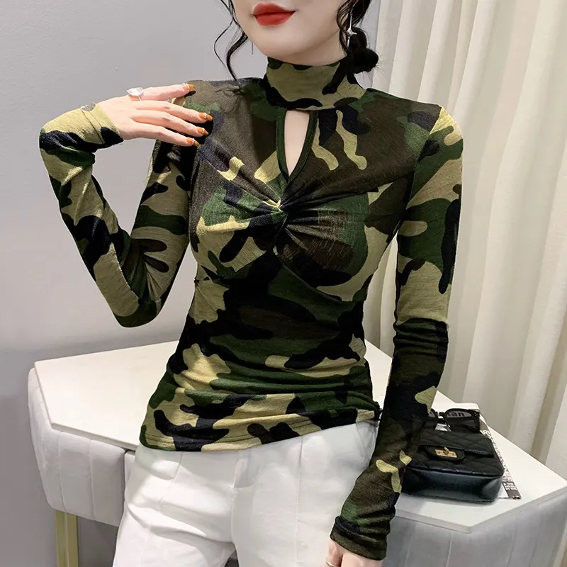 衣都精品- 2022冬季新款高領鏤空修身彈力迷彩長袖上衣