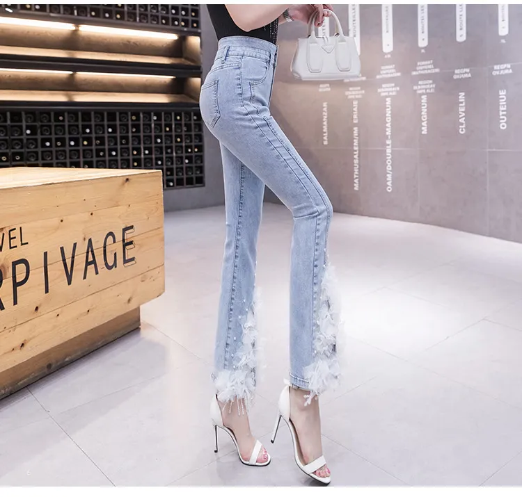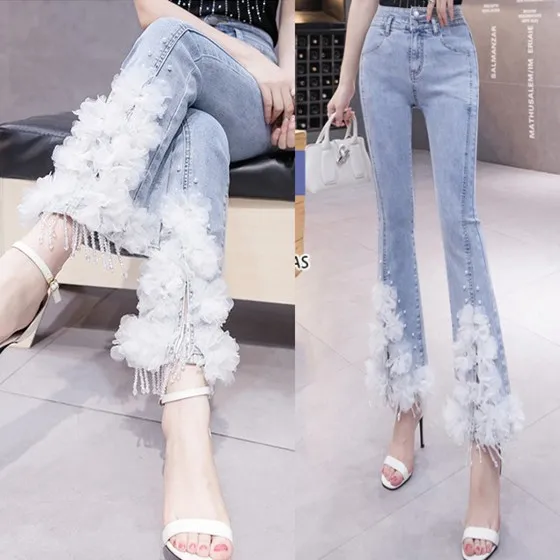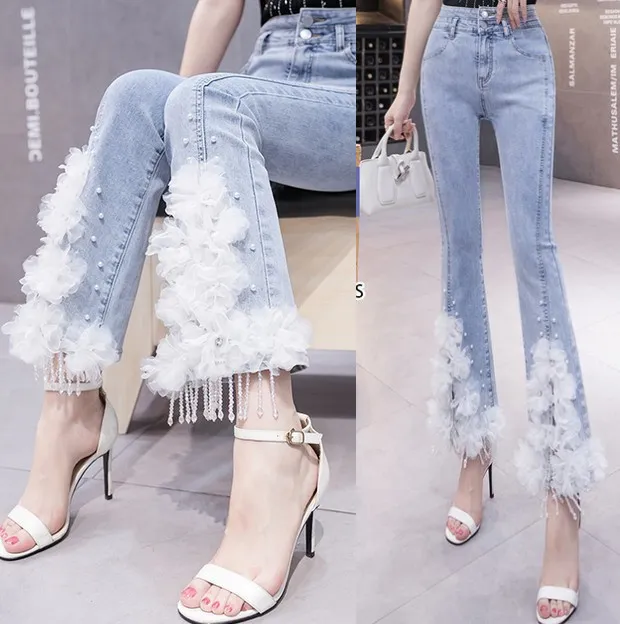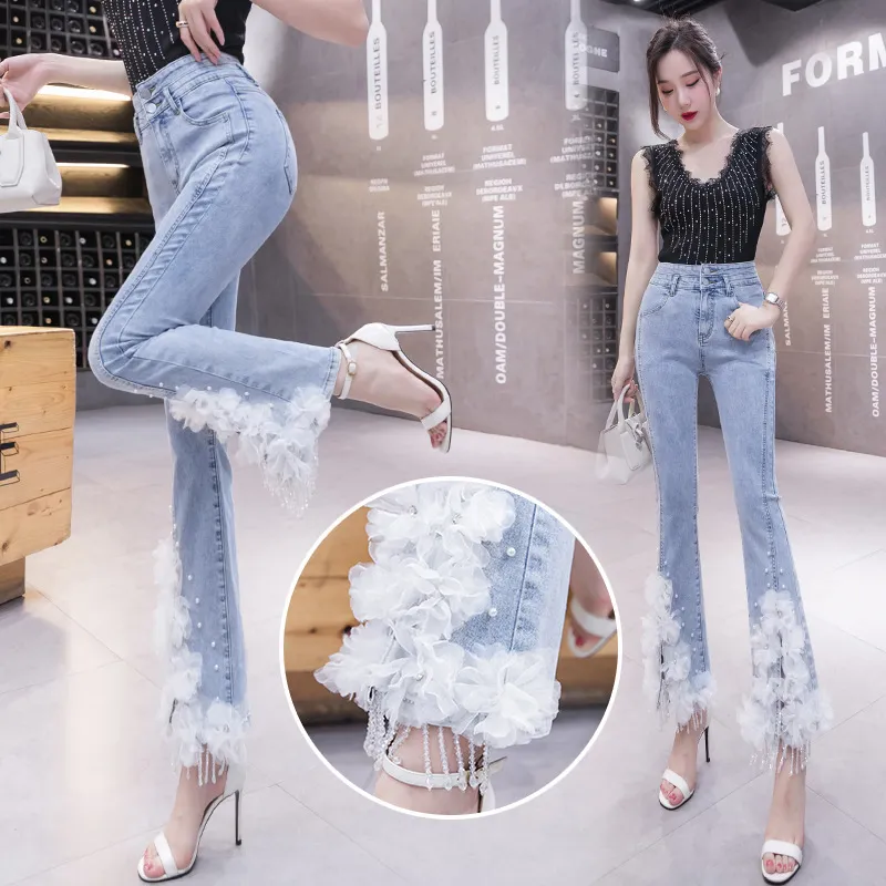 衣都精品- 2022冬季新款設計感重工白色花朵微喇叭牛仔褲