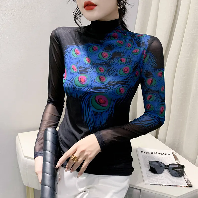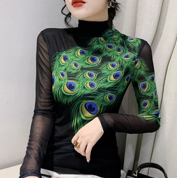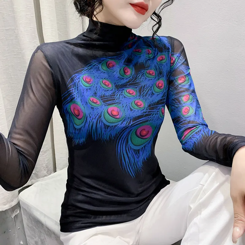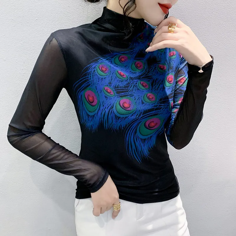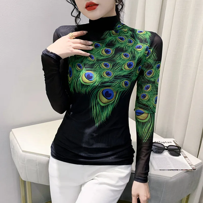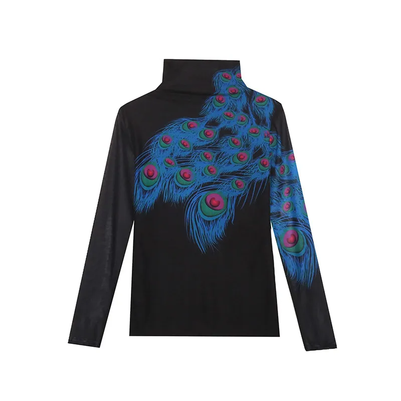 衣都精品- 2022冬季新款內搭羽毛印花高領彈力顯瘦上衣