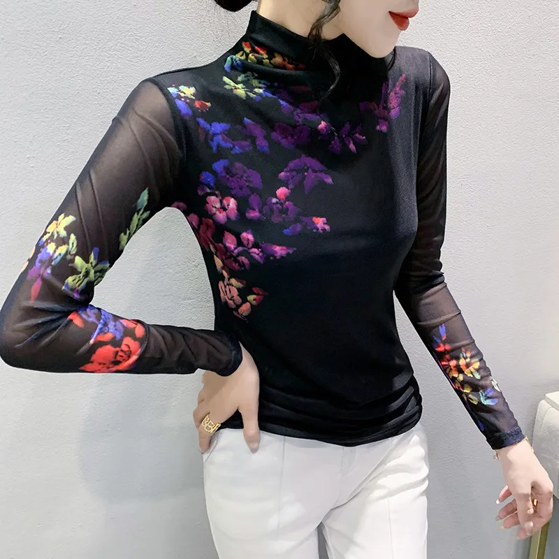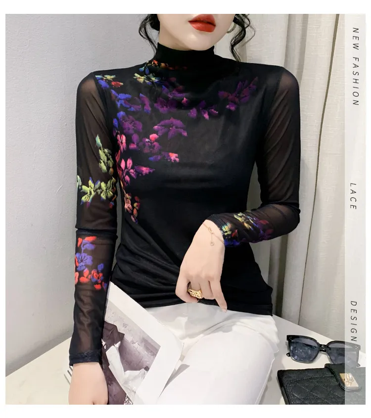 衣都精品- 2022冬季新款內搭羽毛印花高領彈力顯瘦上衣