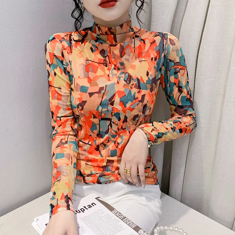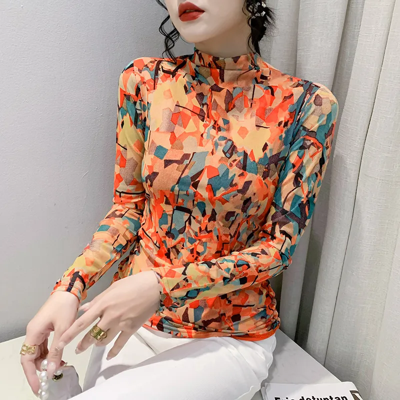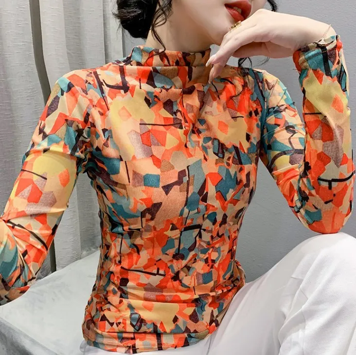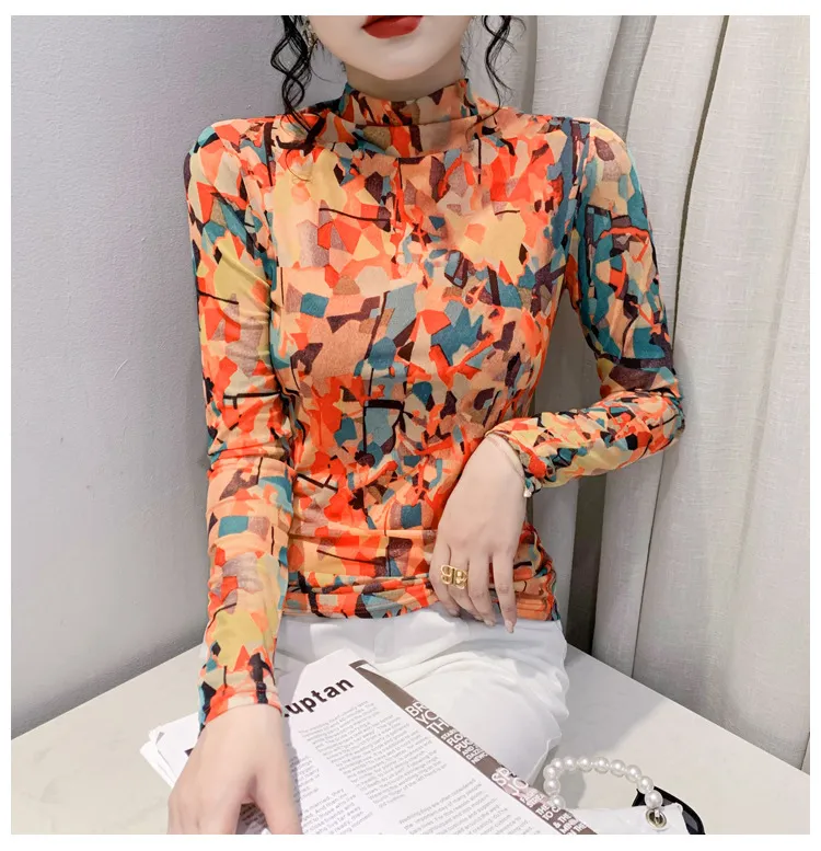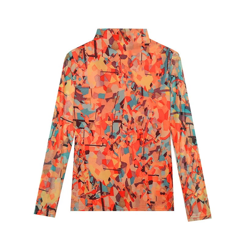衣都精品- 2022冬季新款不對稱拼色網紗樹葉印花油畫上衣