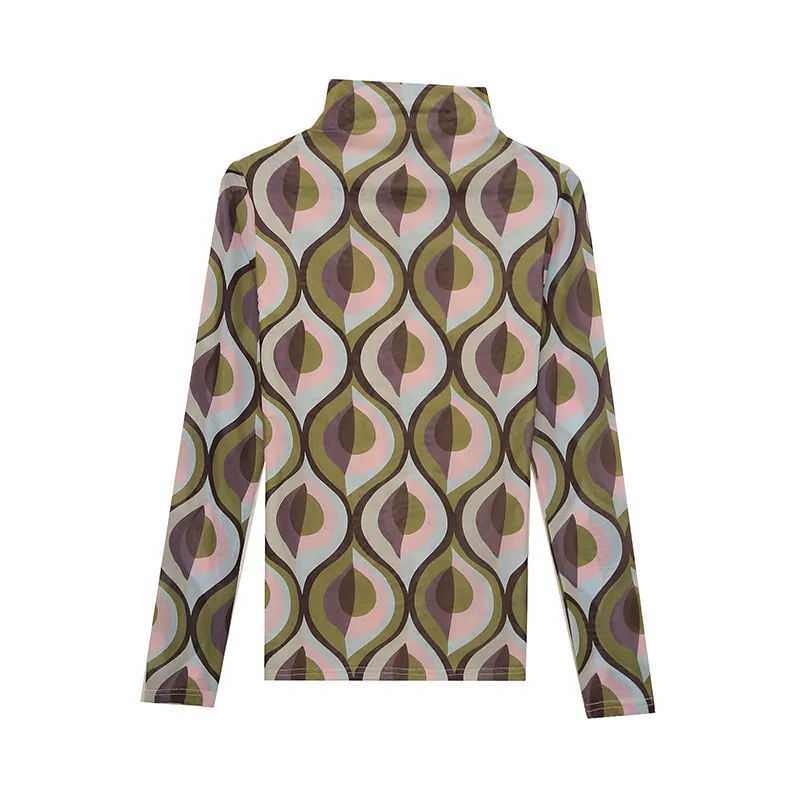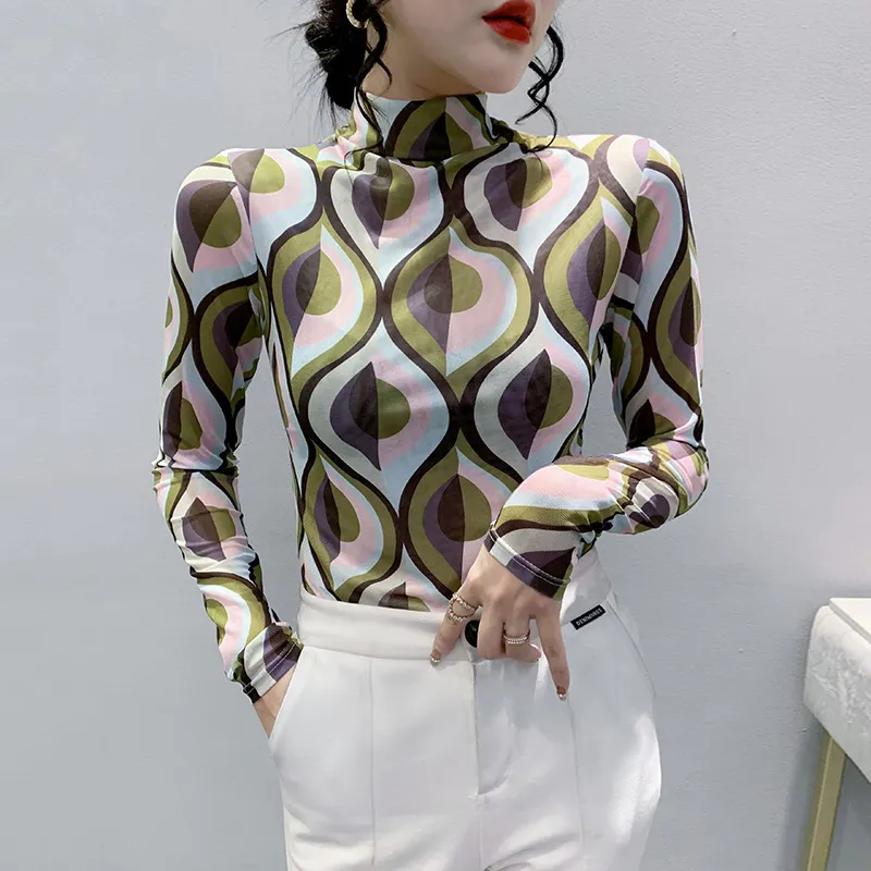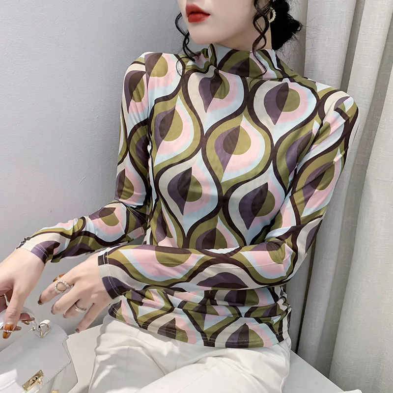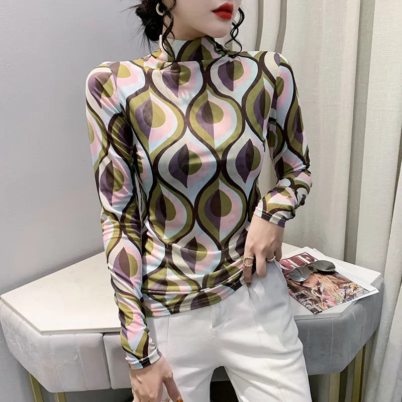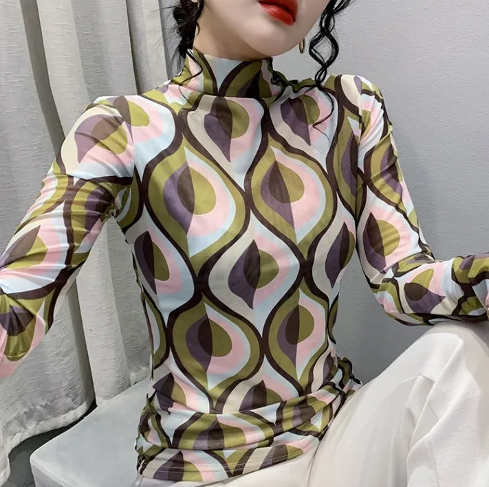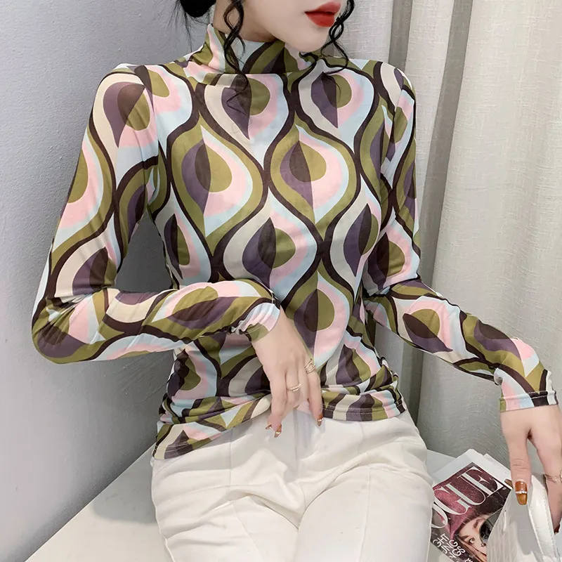 衣都精品- 2022冬季新款優雅大氣菱形網紗高領彈力上衣