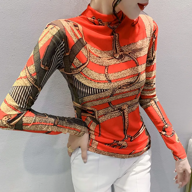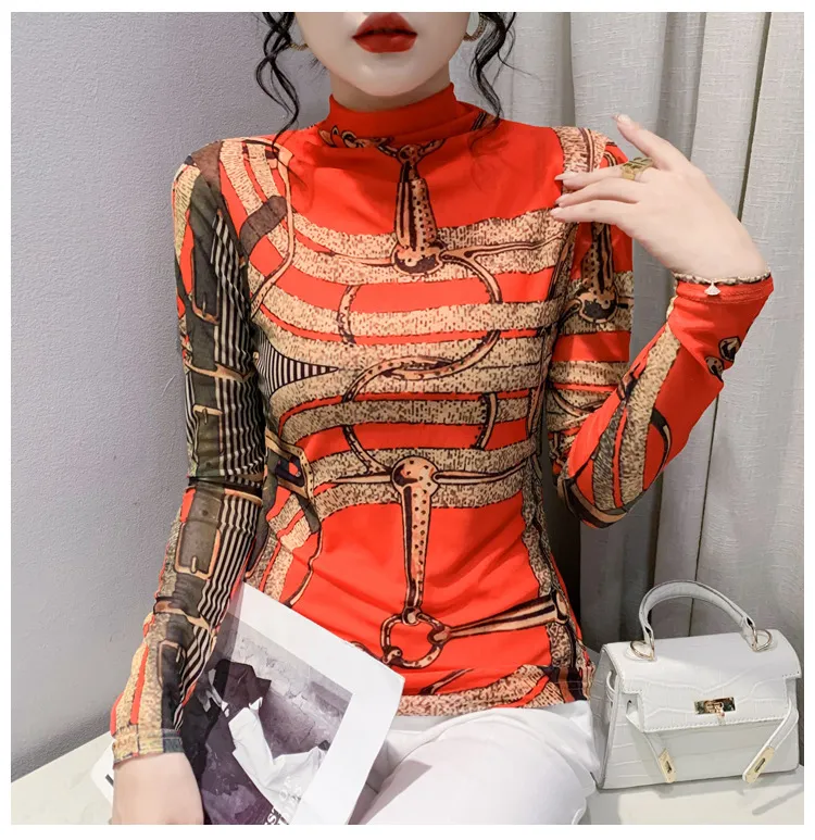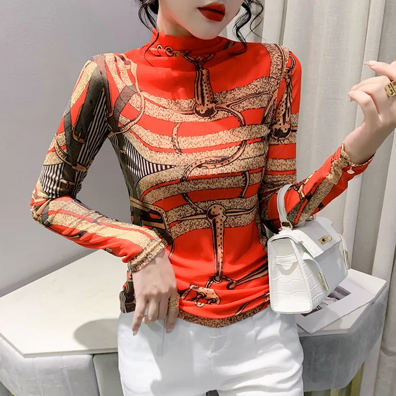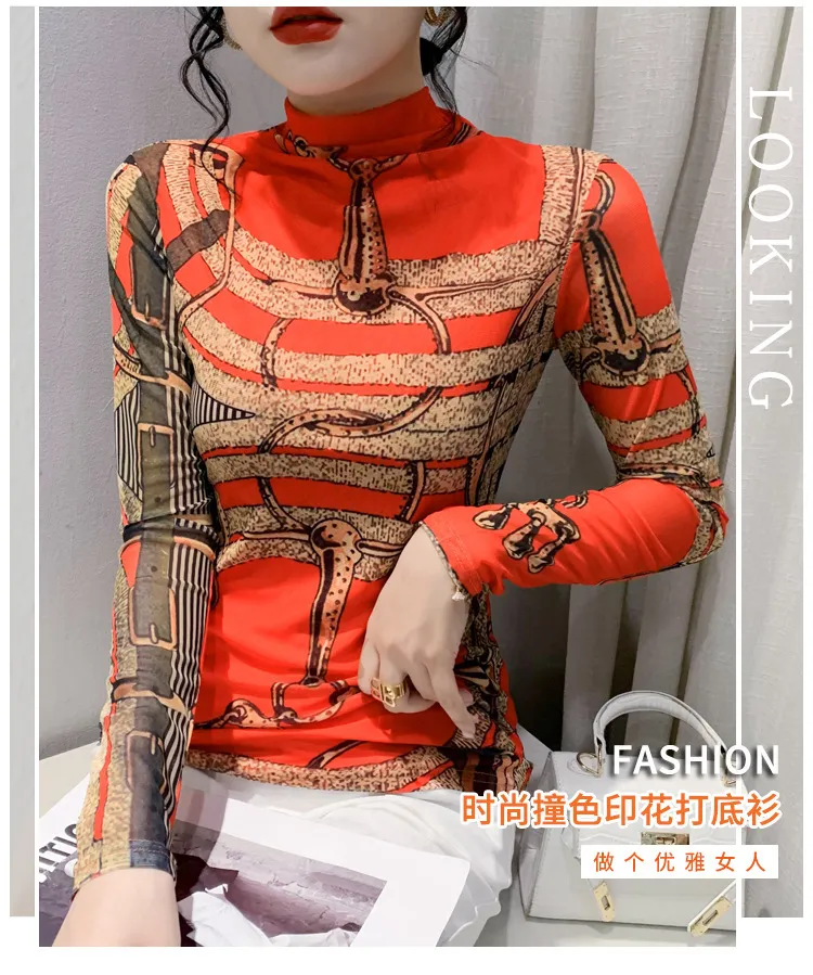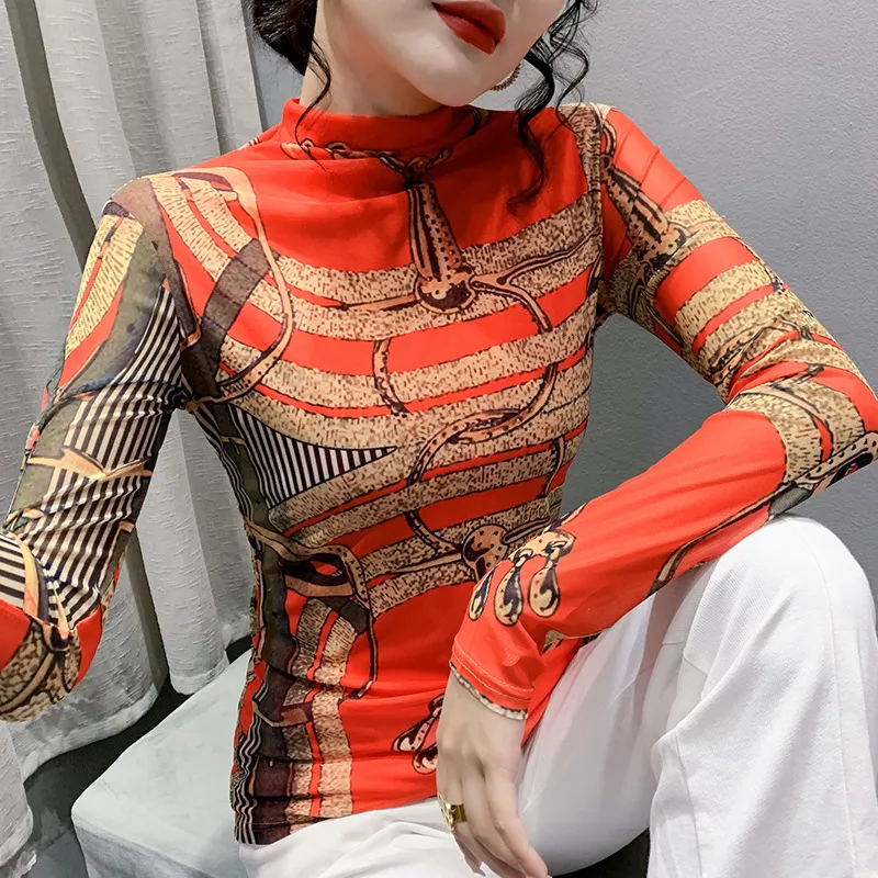 衣都精品- 2022冬季新款優雅大氣菱形網紗高領彈力上衣